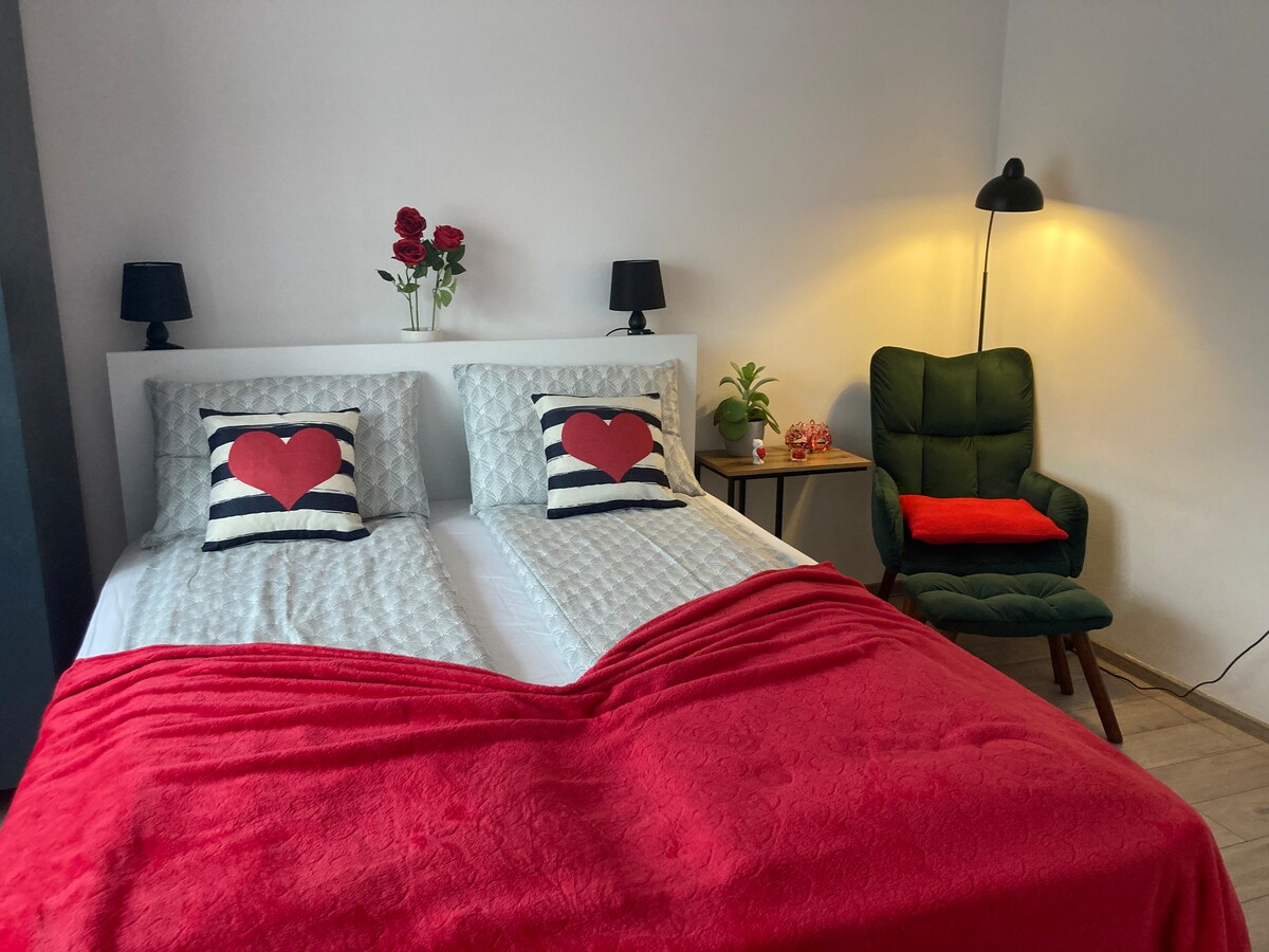 Ten apartament znajduje się w bardzo centralnej części miasta, bardzo blisko Pedestrian and Theater, z łatwym dostępem do restauracji i sklepów. Ponadto blok jest bardziej ustronny, wokół niego jest dużo zieleni. Apartament składa się z 2 oddzielnych sypialni, jednej z łóżkiem 160 cm, a drugiej z sofą (wejście na balkon jest z tego pokoju). Mieszkanie jest nowo urządzone, wyposażone we wszystkie niezbędne udogodnienia na krótszy lub dłuższy pobyt.