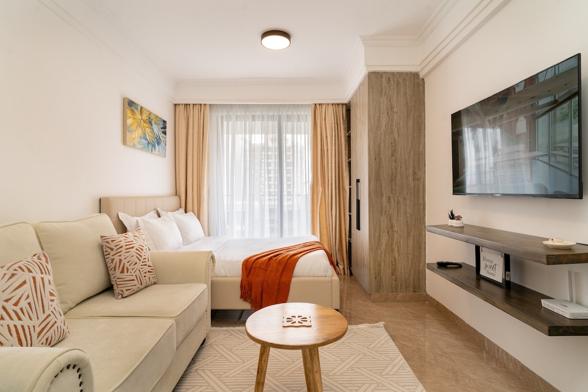 Nowoczesne, eleganckie studio w samym sercu Kilimani z wspaniałym widokiem na miasto. Ciesz się basenem bez krawędzi, siłownią, placem zabaw dla dzieci, salonem z stołem bilardowym i minimarketem na miejscu. Studio oferuje wygodne łóżko typu king-size, szybkie Wi-Fi, kuchenkę gazową, ekspres do kawy, pralkę/suszarkę i przybory toaletowe. Idealne dla podróżnych, cyfrowych nomadów lub osób, które szukają relaksu. Kilka kroków od centrów handlowych, restauracji i całodobowego sklepu monopolowego. Czyste, przytulne i idealnie zlokalizowane.