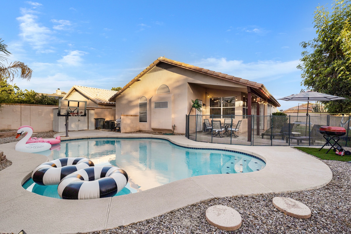 *OBNIŻONE CENY! Poznaj AZ w komforcie! Ten pięknie odnowiony dom z 4 sypialniami ma wszystko, czego potrzebujesz do relaksującego wypoczynku! Z błyszczącym podgrzewanym basenem, stołem bilardowym, grami planszowymi i telewizorami w każdej sypialni, będziesz mieć nieskończoną rozrywkę. Pełen zestaw udogodnień sprawia, że czujesz się jak w domu. Przyjedź z rodziną i znajomymi! Ten przytulny dom i podwórko są gotowe na zachody słońca w AZ i wspaniałe chwile! REZERWUJ TERAZ! **Podgrzewany basen dostępny za dzienną opłatą * Należy poprosić o funkcje ogrzewania basenu.
