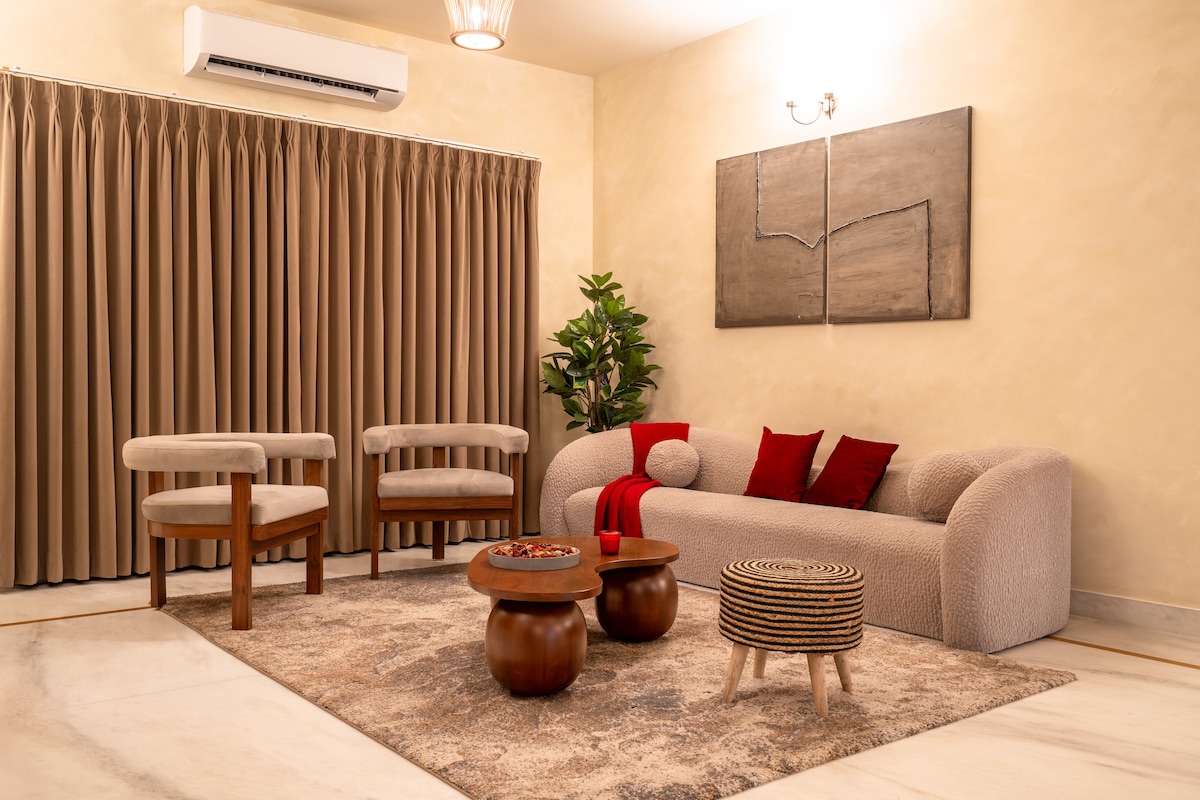 Zanurz się w naszym eleganckim apartamencie z 2 sypialniami w ekskluzywnej dzielnicy Banjara Hills w Hajdarabadzie. Idealne dla rodzin lub osób podróżujących służbowo, to nowoczesne miejsce może pomieścić 4 gości. Szybkie Wi-Fi, w pełni wyposażona kuchnia i prywatny balkon. Idealna baza wypadowa, położona w pobliżu HITEC City, najlepszych sklepów i restauracji. Bezpieczne, prywatne i stylowe. Ta spokojna okolica w pobliżu najlepszych szpitali jest idealna dla pacjentów i ich rodzin. Uwaga: jest to jedna z dwóch jednostek w budynku, położona na NIŻSZYM POZIOMIE