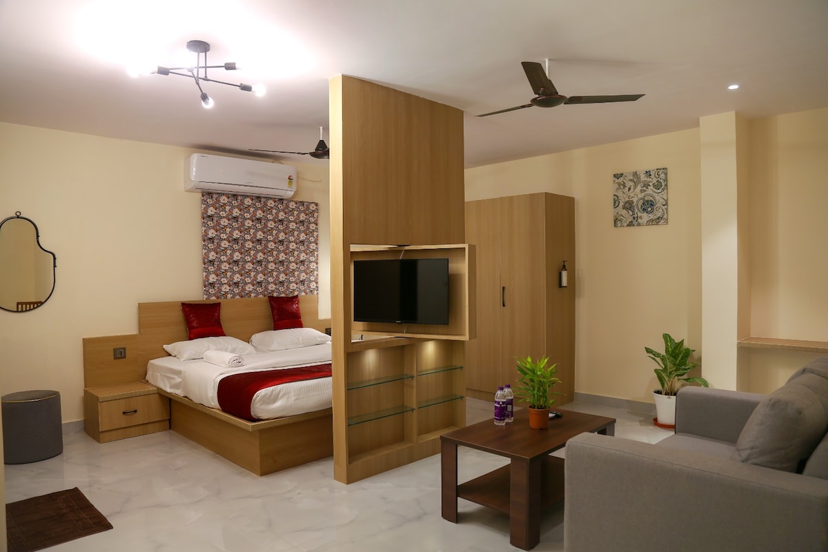 Zatrzymaj się w nowoczesnym apartamencie z obsługą w pobliżu Hitech City. Zaledwie kilka minut od centrów IT, Gachibowli, Madhapur i dzielnicy finansowej. Ciesz się przytulnym salonem z Wi-Fi i telewizorem Smart TV, w pełni wyposażonym aneksem kuchennym, wygodną sypialnią z pościelą premium i czystą łazienką z ciepłą wodą. Idealne dla osób podróżujących służbowo, rodzin lub na dłuższy pobyt – oferują komfort domu z obsługą jak w hotelu.