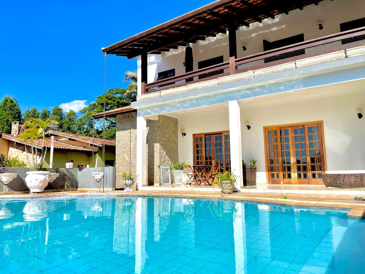 🚩Pague sua viagem em até 6 x SEM juros Casa de Campo ILUMINADA, arejada e confortável COND.FECHADO c/ vigilância 24h 5 QUARTOS, sendo 1 suíte c/ hidro 5 BANHEIROS + lavabo Área c/ churrasqueira, forno de pizza, fogão a lenha e cervejeira Sala c/ LAREIRA Deixamos a FOGUEIRA montada PISCINA (10m x 4m, sem aquecimento) Gramado c/ GOLZINHO INTERNET fibra óptica(400MB) COMÉRCIOS próximos Condomínio com mercadinho de AUTOATENDIMENTO ACESSO por estrada pavimentada PET friendly (casa cercada)