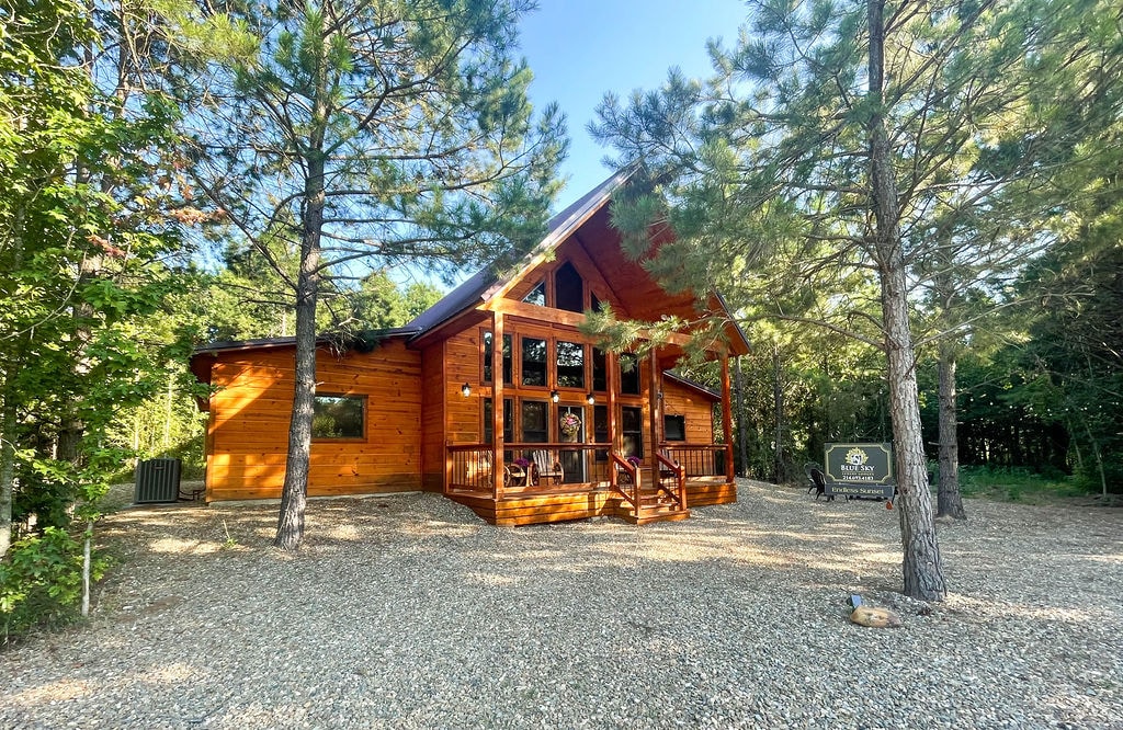 Błękitne niebo z @CabinsandCampfire Przytulny dom z luksusową sypialnią z łóżkiem typu king, kuchnią dla smakoszy i spokojną przestrzenią na świeżym powietrzu, gdzie można odpocząć przy ognisku lub w wannie z hydromasażem. ✨ Łazienka typu spa 🛁 Relaksujące jacuzzi 🔥 Kominek i palenisko na świeżym powietrzu Gramofon 🎶 Crosley z albumami w stylu vintage 🐾 Miejsca na pobyt przyjazne zwierzętom