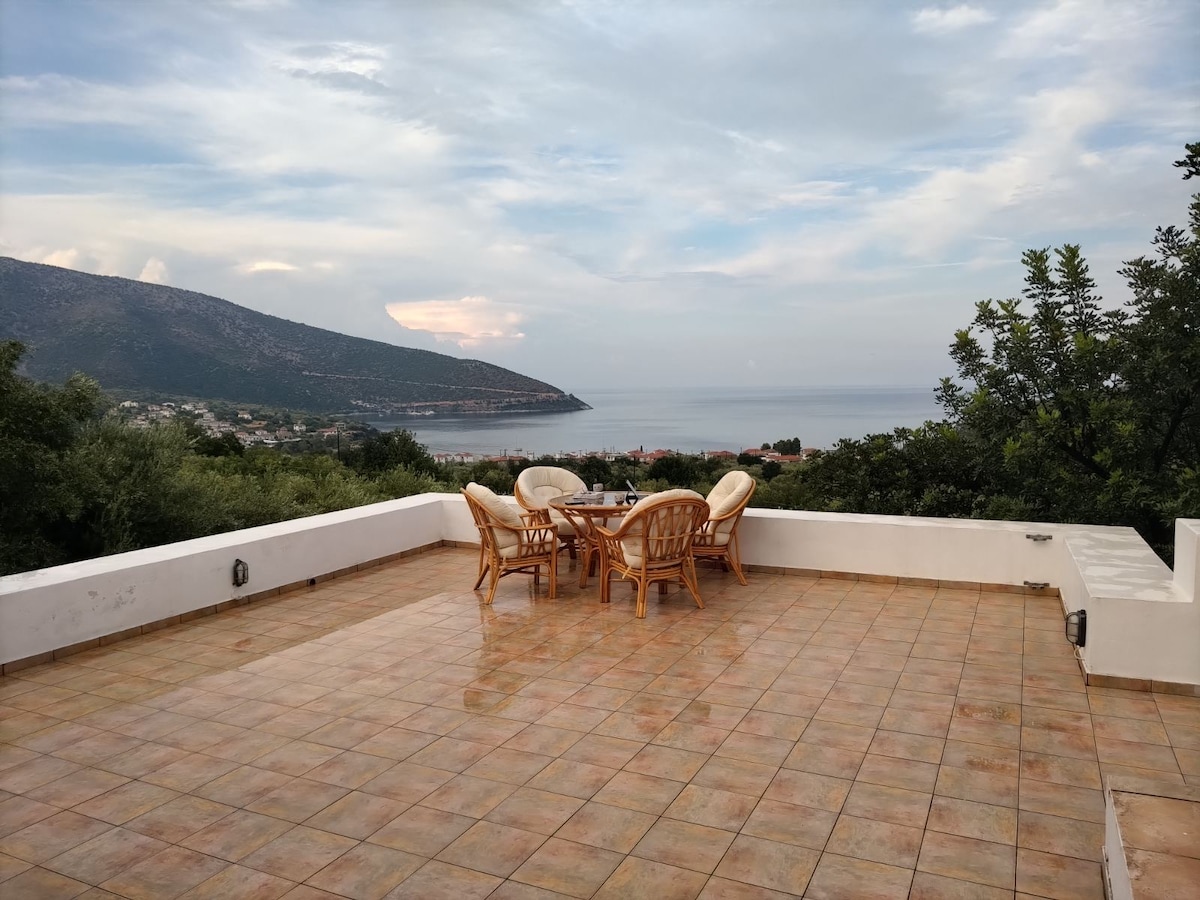 Witamy w Meda House, miejscu, które możesz nazwać domem. Idealny dla grup lub rodzin, dom ma 2 piętra z różnymi wejściami. Prosto urządzony z rustykalnymi akcentami, nasz dom ma 2 sypialnie, 2 łazienki, 1 salon, w pełni wyposażoną kuchnię i 2 balkony, z których można podziwiać wspaniały widok... Po lewej stronie można podziwiać imponujące góry, a z przodu Morze Egejskie. Wiosną i latem zapach kwiatów pomarańczy i cytryny z naszego ogrodu rozpieszcza zmysły...