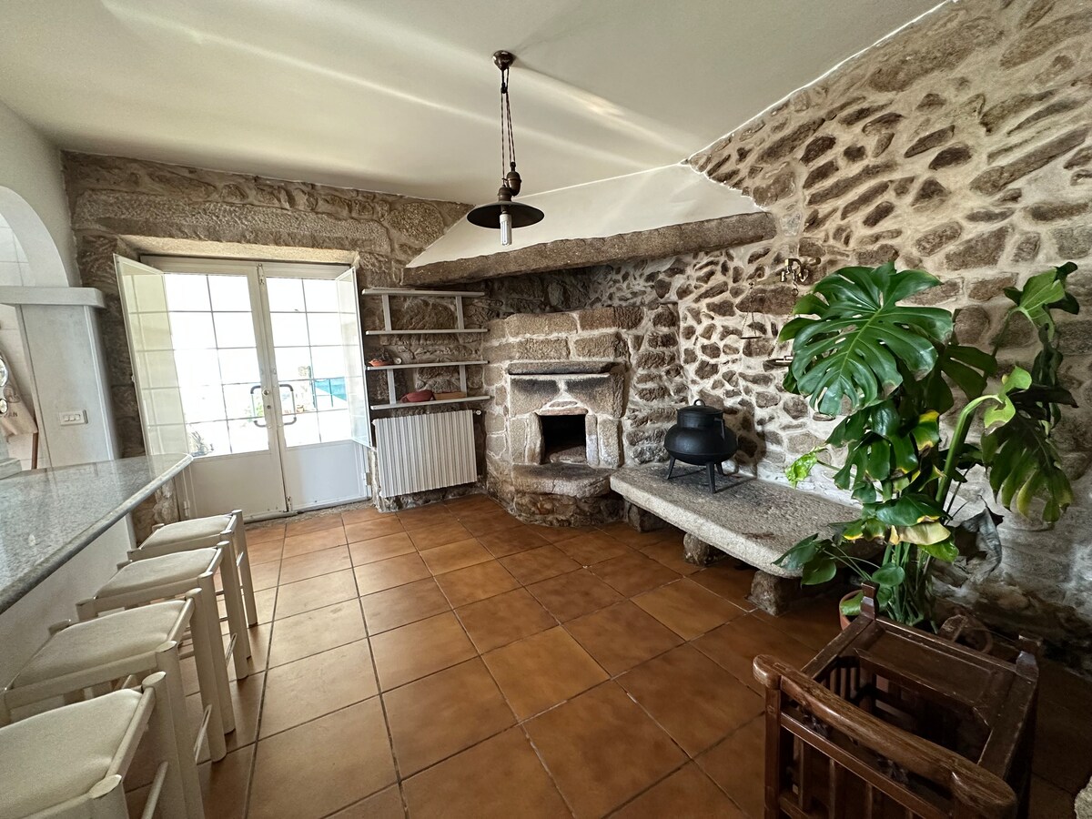 LUKSUSOWA willa z basenem 9 x 4, 200 metrów od plaży, odrestaurowany stary kamień i drewno, kamienny kominek (zawiera drewno) 3 jadalnie. Ogród o powierzchni 1500 m2 z basenem o wysokości 0,5 m do 1,8 m, płaska trawa, zadaszony drewniany ganek 10 m, koksownik / bardzo duży grill. Duży parking wewnętrzny. Widoki na Ria de Pontevedra i Ons i Wyspy Sansenxo Całkowita prywatność, automatyczny portal, alarm z czujnikami, brak sąsiadów i nieprzezroczyste ściany.
