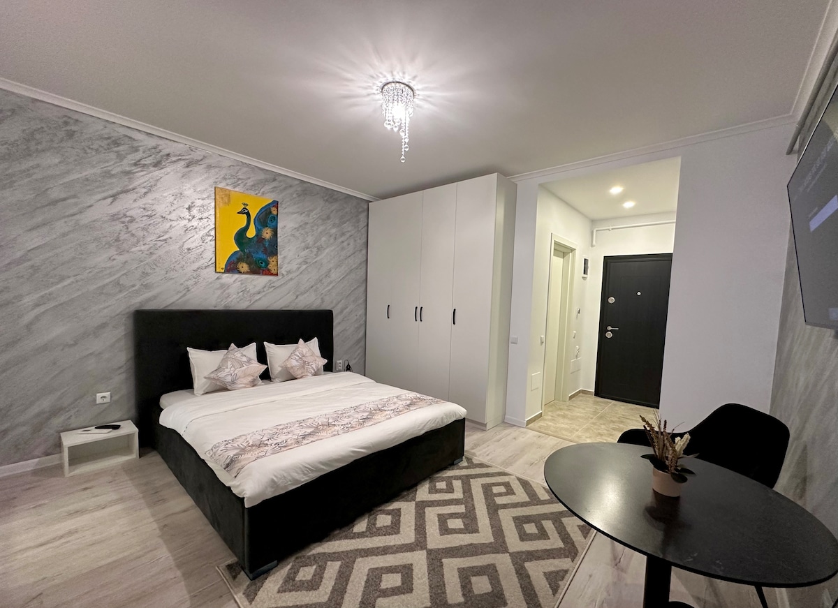 This stylish studio offers you a great stay in a peaceful area , but very close to main attractions in North Bucharest and only 20 -30 mins far away from the city center . The studio has around 40 sqm, it is suitable up to 3 persons. The sleeping area with the bed is very comfortable, the living room is also very cozy. The bathroom has a shower and the kitchen is very spacious. The balcony is not very big and has no view but is friendly enough to enjoy your coffee and to smoke.