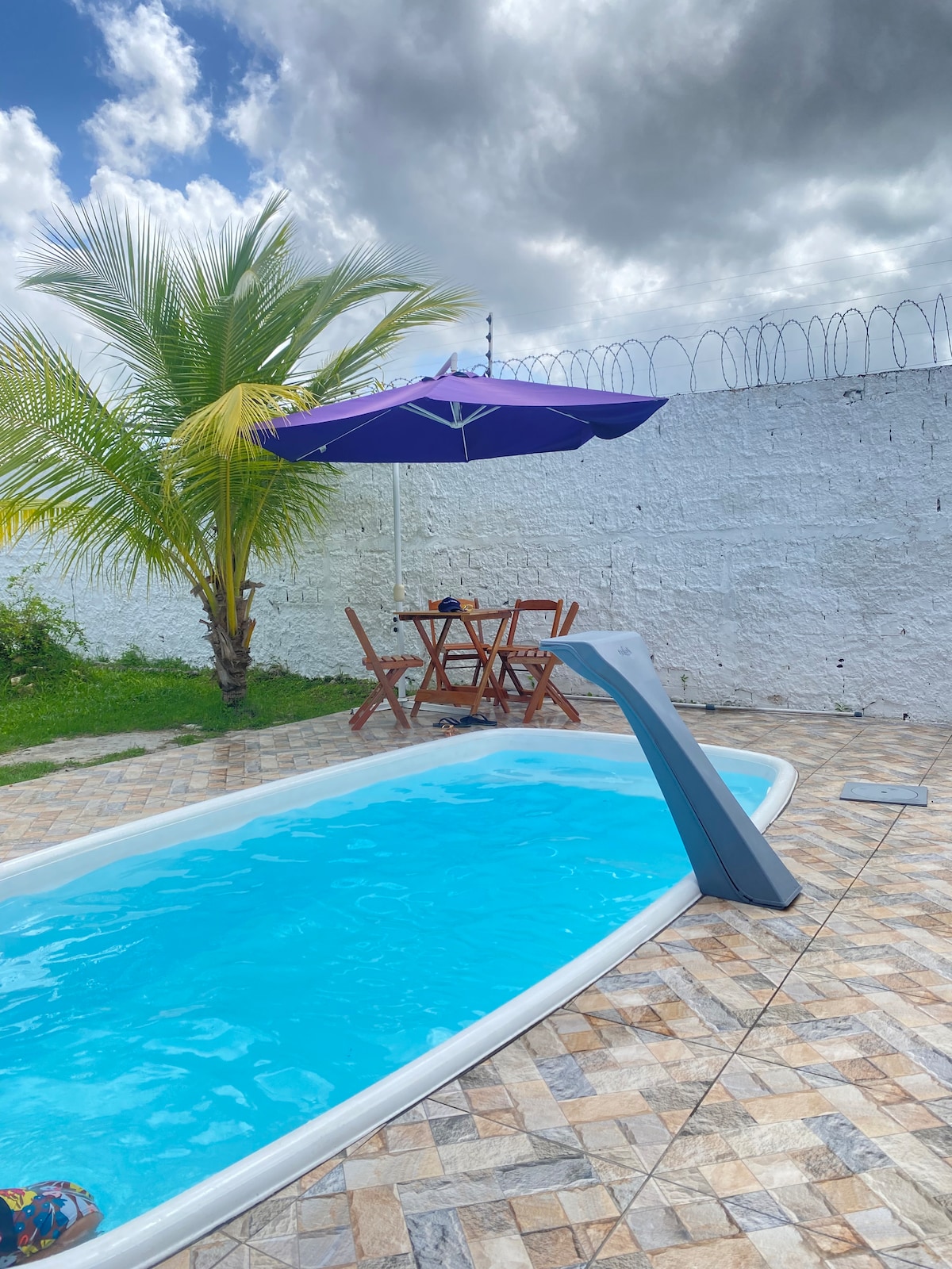Experiência relaxante com toda a família nesta acomodação super agradável Suite: 1 cama de casal e uma de solteiro, com split e banheiro. Quarto 1: 1 cama de casal e 1 cama auxiliar de solteiro, com split Quarto 2: 1 cama de casal e 1 cama de solteiro, com ar-condicionado Armadores de rede nos quartos, varanda e sala 4 ventiladores Poço artesiano, água filtrada. Internet wi-fi TV na sala com Netflix, prime vídeo, Max, Disney e Mub. Piscina, churrasqueira e área verde. Portão elétrico.