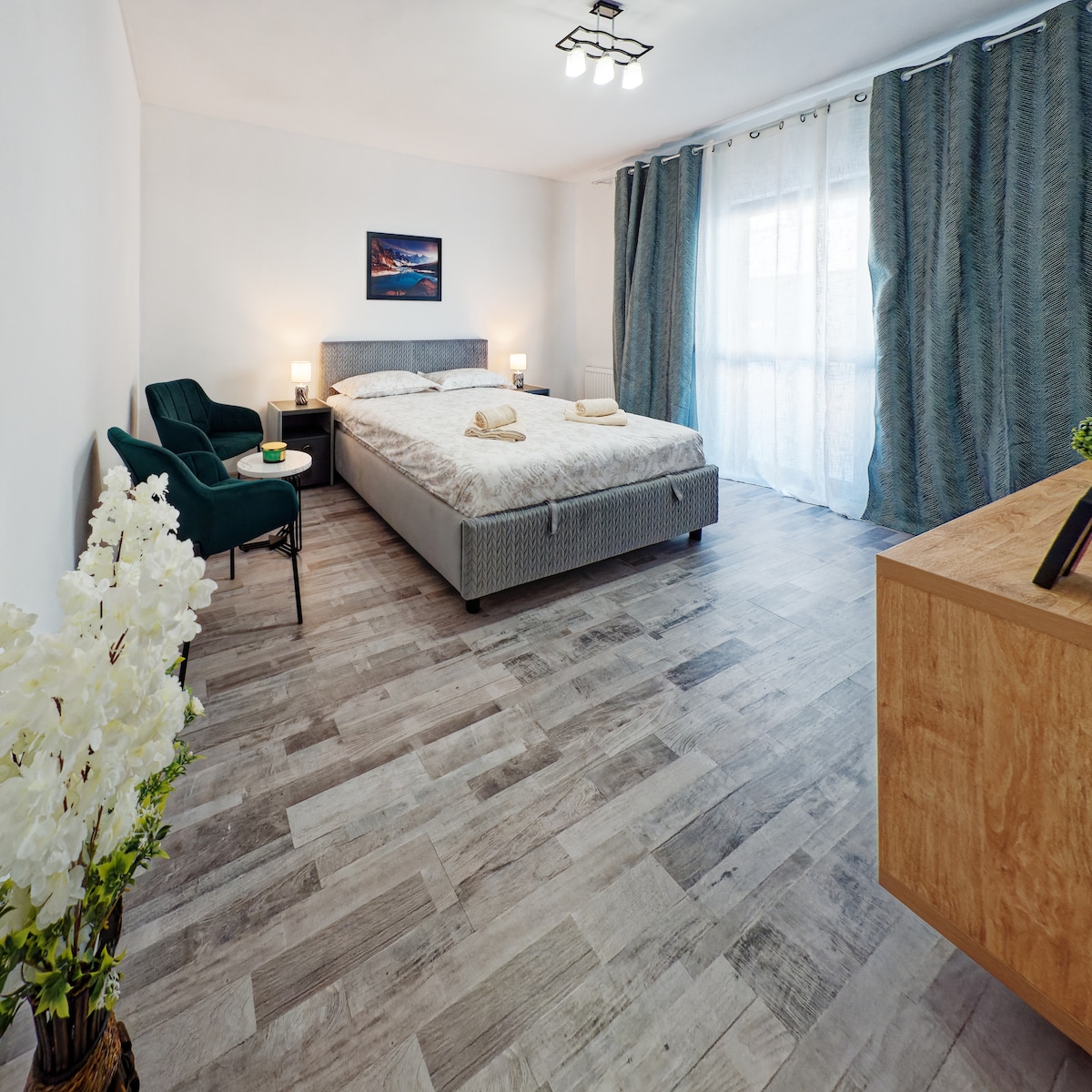 Witamy w naszym nowym, uroczym apartamencie położonym w „najmłodszej” części Braszowa. W pełni umeblowana, sypialnia z dużym łóżkiem typu king size i przytulnym siedziskiem przy oknie, łazienka w stylu retro z kabiną prysznicową, salon z barem, kominkiem, jedną wygodną sofą i w pełni wyposażoną kuchnią, w otwartej przestrzeni. Apartament znajduje się 5 minut spacerem od centrum handlowego Coresi i 20 minut autobusem od centrum Starego Miasta (4 km). Dworzec kolejowy znajduje się 15 minut jazdy autobusem (2 km).