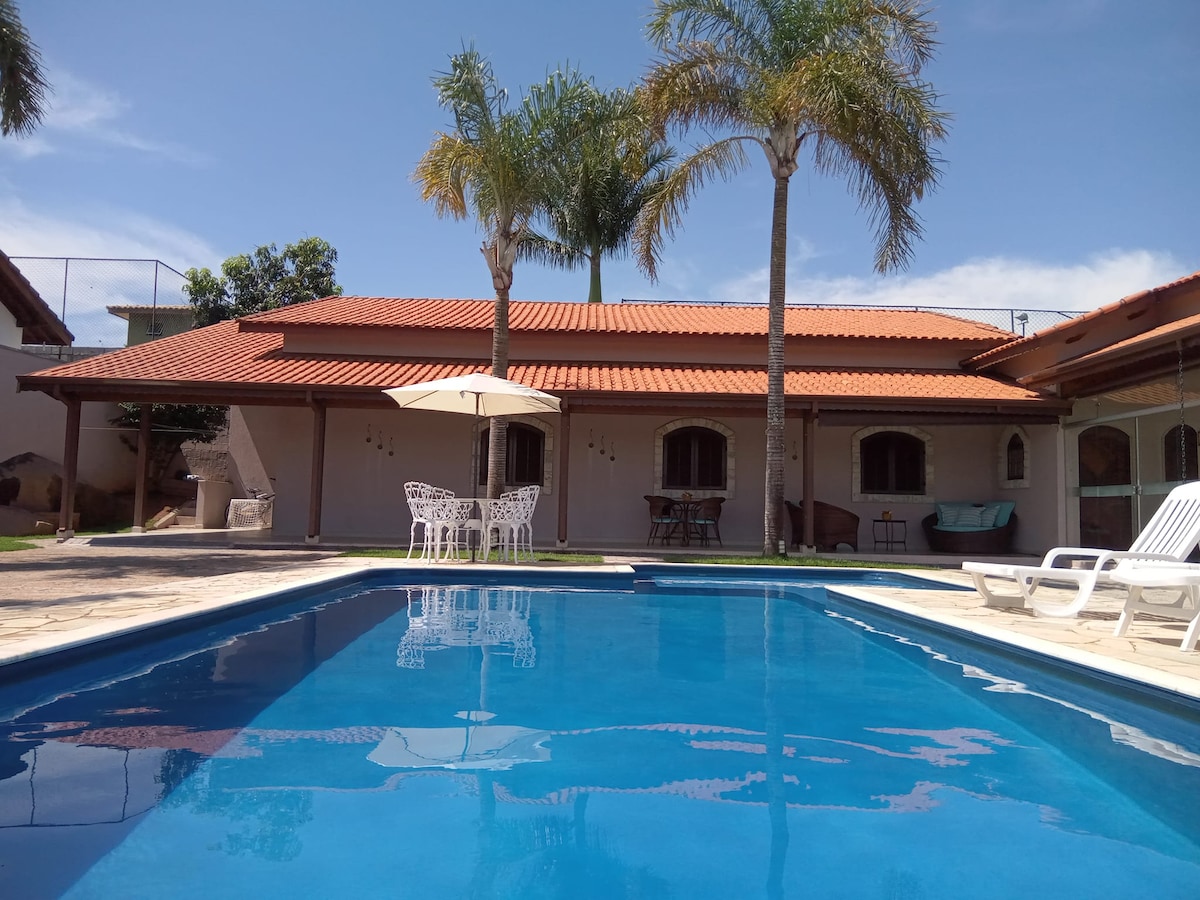 W pobliżu lotniska Viracopos, 12 minut od centrum Indaiatuba, cały teren ogrodzony i bardzo bezpieczny. Łatwy dostęp i sklepy w pobliżu. Pojemność 15 osób, 4 sypialnie, 4 łazienki, salon, kuchnia ze wszystkimi przyborami, wszystkie pokoje z wentylatorem sufitowym, 3 lodówki, duża kuchenka. Zadaszony balkon ze stołami i krzesłami dla 20 osób, basen, boisko do piłki nożnej, sala gier i grill z piecem i piecem na drewno (góra)! Uwaga: Nie wynajmujemy na imprezy lub przyjęcia, nie można głośno słuchać muzyki!