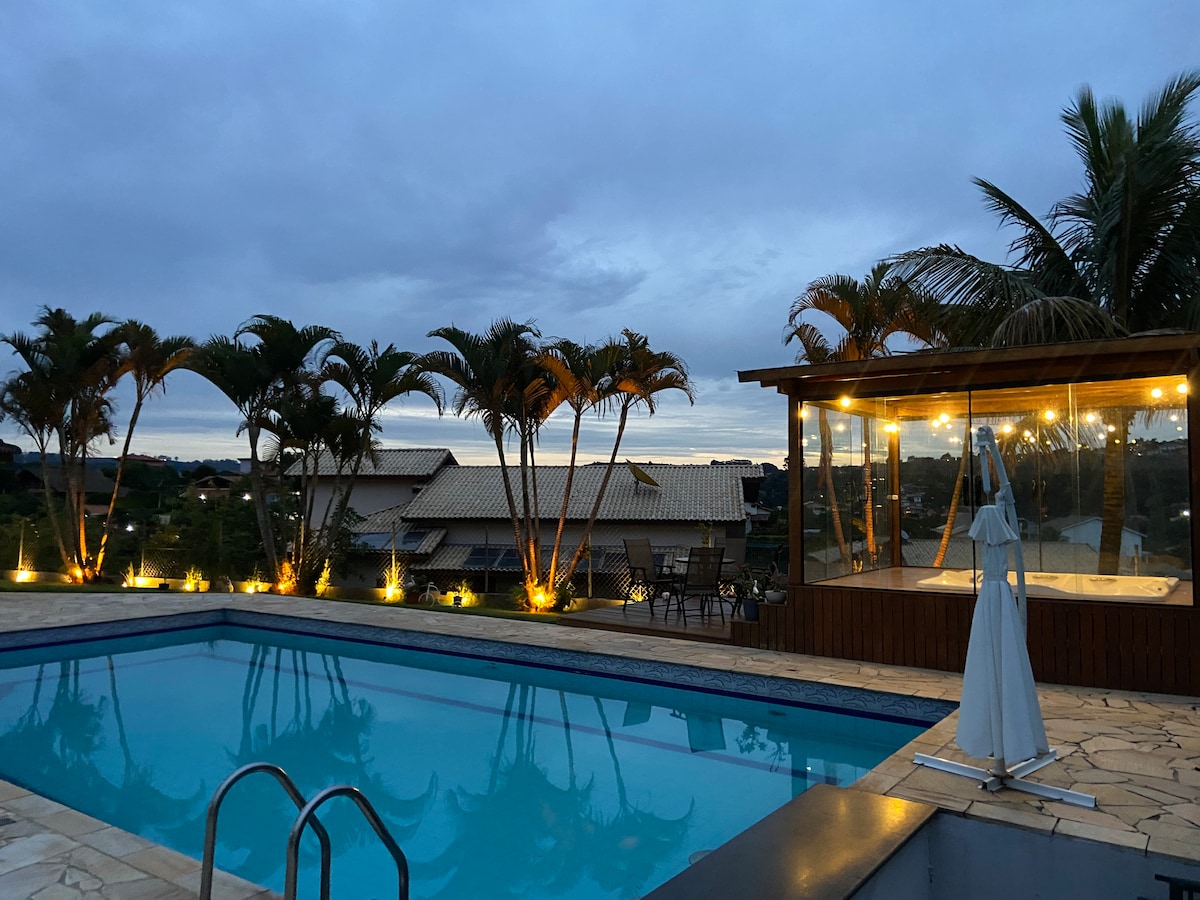 PISCINA climatizada SAUNA JACUZZI 7 lugar(água quente GARANTIDA) Cama elástica Sinuca profissional Pebolim Campo de futebol CONDOMÍNIO c/ segurança 24h AR-CONDICIONADO EM 3 quartos WI-FI 100mega 4 quartos-2suíte + 2 banheiro completo + 1 lavabo Casa estilo rústico Lareira🔥 Sofá em couro Quarto c/ toalha e roupa cama Pomar e horta Lago ornamental Churrasqueira Forno de pizza Bar molhado na piscina Vista privilegiada TV a cabo com filmes Cozinha completa Cafeteira ACEITA PETS Não aceita festas