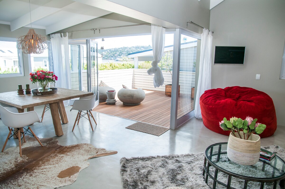 Ten luksusowy, przestronny, otwarty apartament z prywatną werandą z grillem oferuje widok na lagunę i jest gotowy, aby spełnić Twoje wymarzone wakacje!! Bezpiecznie położone w Thesen Harbour Town z prywatnym parkingiem na miejscu. Mieszkanie zostało wyposażone w zapasową moc podczas odciążania /przerw w dostawie prądu, która powinna być wystarczająca przez cały okres w zależności od etapu załadunku realizowanego w tym czasie.