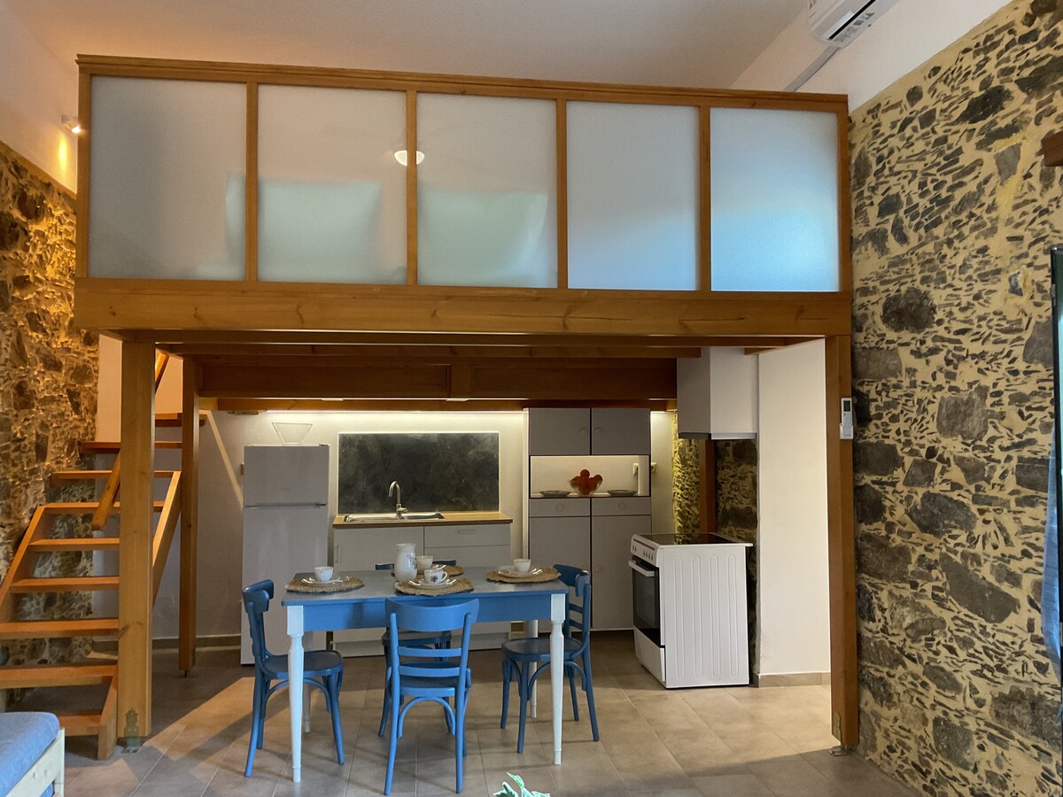 The apartment Anaxagoras consists of an open-plan residential complex and is characterized by an imposing original Venetian arch, which separates the kitchen and living area from sleeping. It has direct access to your (private) garden with barbecue and large dining table with sea view. Everything has been renovated with lots of love for the traditional details in 2017. Here you can inhale a touch of Cretan history in a unique and comfortable atmosphere.