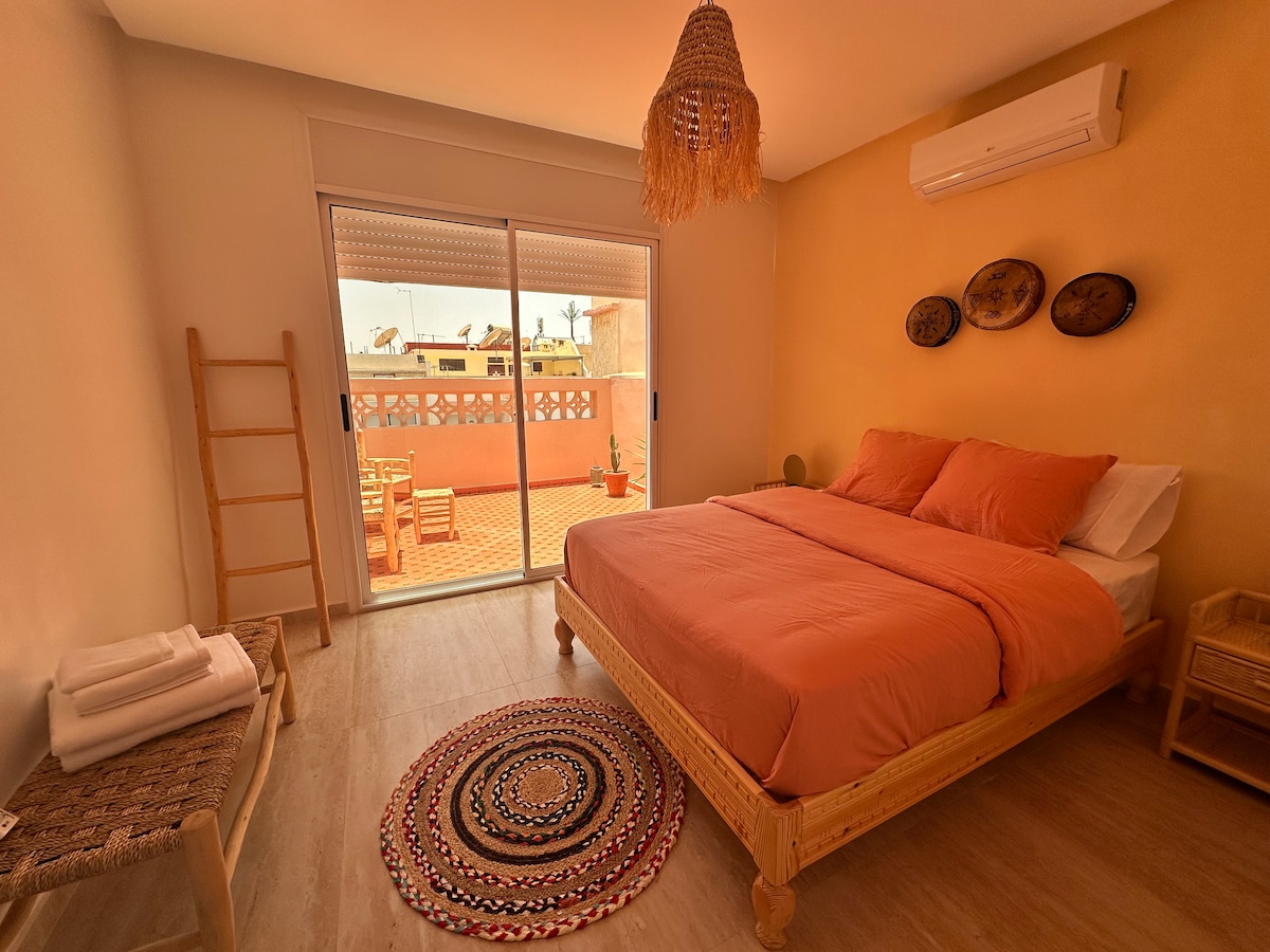 Blending Moroccan authenticity with modern comfort, enjoy a peaceful stay in Agadir. Sunny private terrace with open views, perfect for relaxing or enjoying a cup of tea. Ideal for couples and digital nomads, with a comfortable workspace and fast fiber Wi-Fi. ✔ Flexible self check-in ✔ Complimentary coffee & tea ✔ Quiet neighborhood ✔ Free parking 📍 Nearby (by car): • Agadir Bay – 5 min • Souk El Had – 7 min • Beach – 9 min • Aourir – 28 min • Taghazout – 35 min