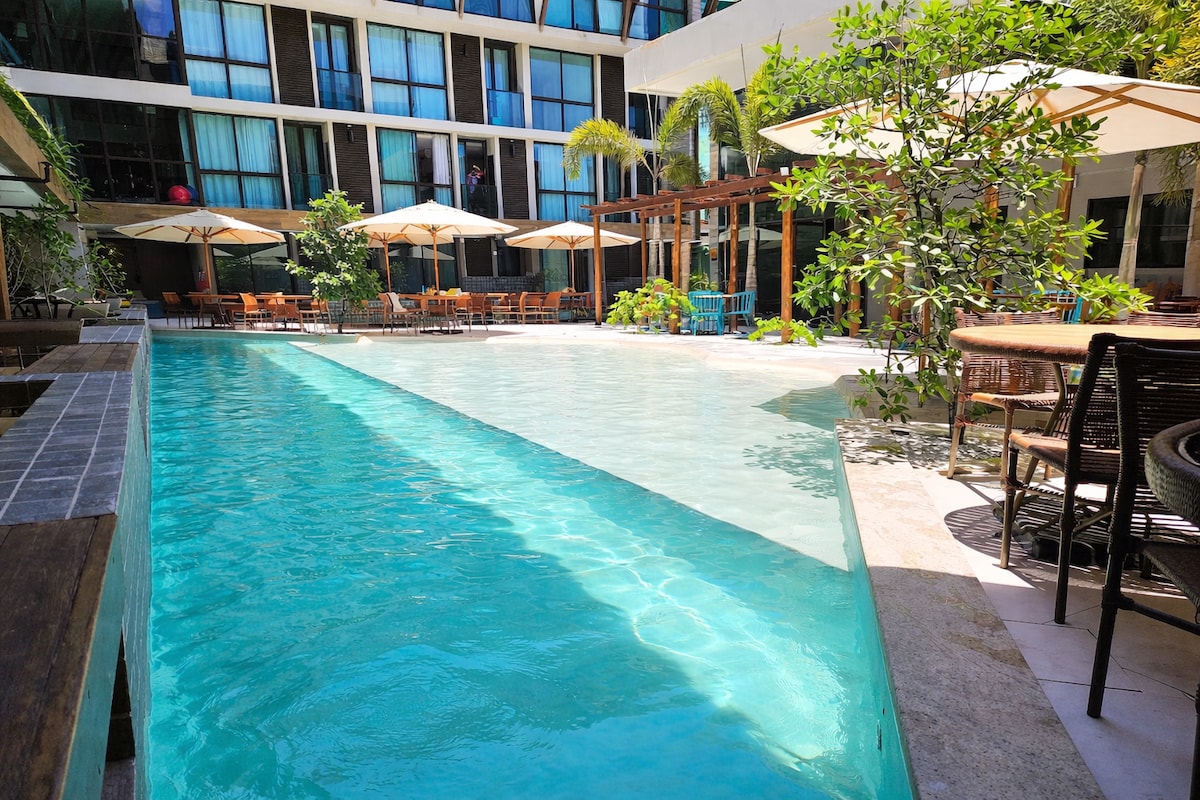 Mieszkanie jest przestronne, z w pełni wyposażonym kondominium o powierzchni 45 m², piaszczysta stopa z dostępnymi parasolami: ✔1 WC ✔1 sypialnia z 1 podwójnym łóżkiem i 1 łóżkiem pomocniczym ✔1 salon z rozkładaną sofą ✔1 zapasowy materac ✔Balkon z widokiem na morze ✔2 duże baseny z barem i restauracją ✔Sądy: multi-sport, siatkówka plażowa/siatkówka, piłka plażowa ✔Playground and Game Salon ✔Academia and Sauna Plac zabaw dla dzieci