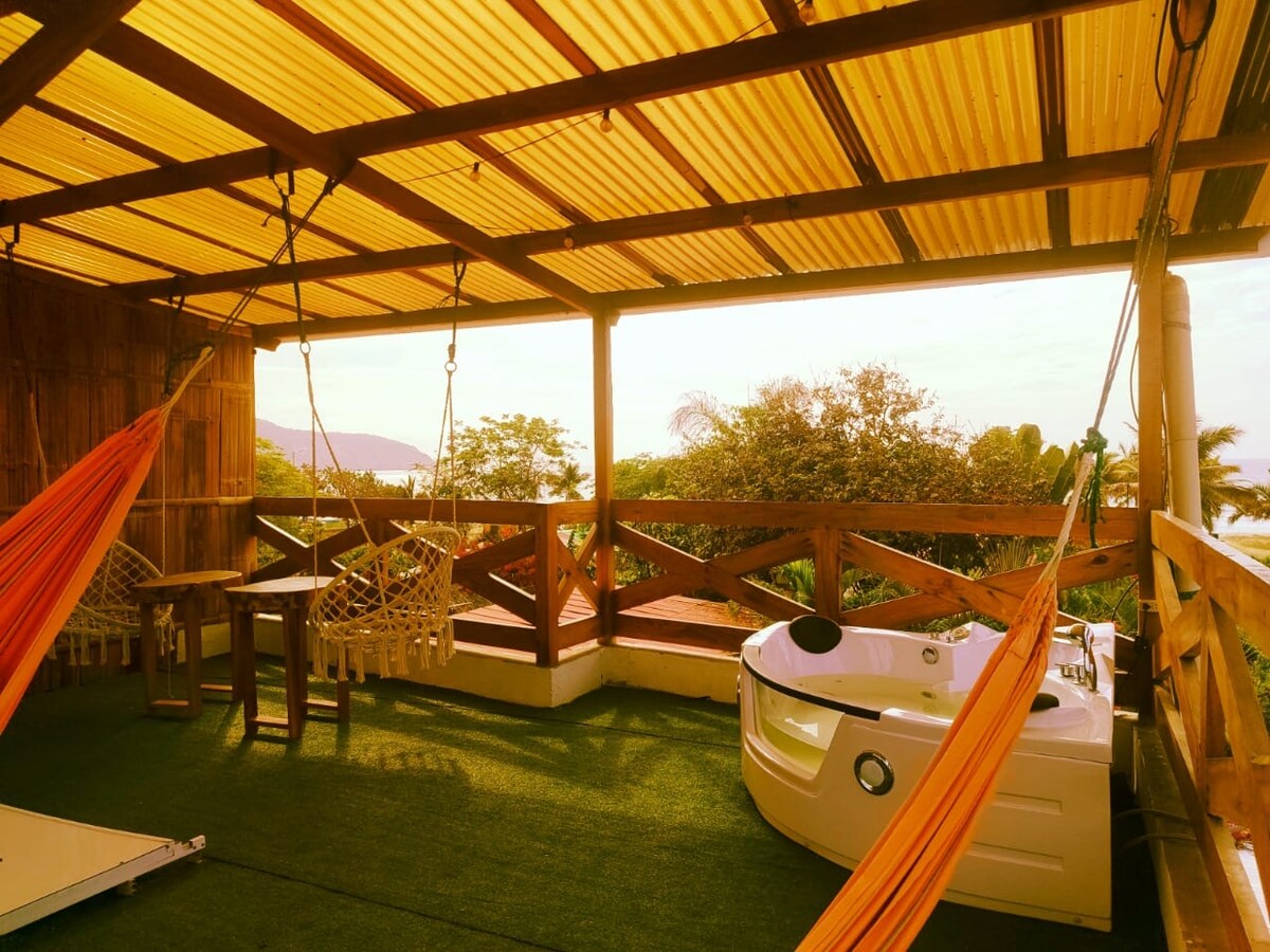 Ta chatka wykonana z naturalnych materiałów znajduje się na szczycie wzgórza, na skraju rezerwatu leśnego i zapewnia wspaniałe panoramiczne widoki na Ayampe Beach (z kultową Islote of the Ahorcados) i las tropikalny. Możesz z niej kontemplować przezroczyste i pełne gwiazd noce, spać z odległym rykiem morza, obudzić się przy dźwiękach tropikalnych ptaków i cieszyć się najlepszymi zachodami słońca oferowanymi przez równikowy Pacyfik.