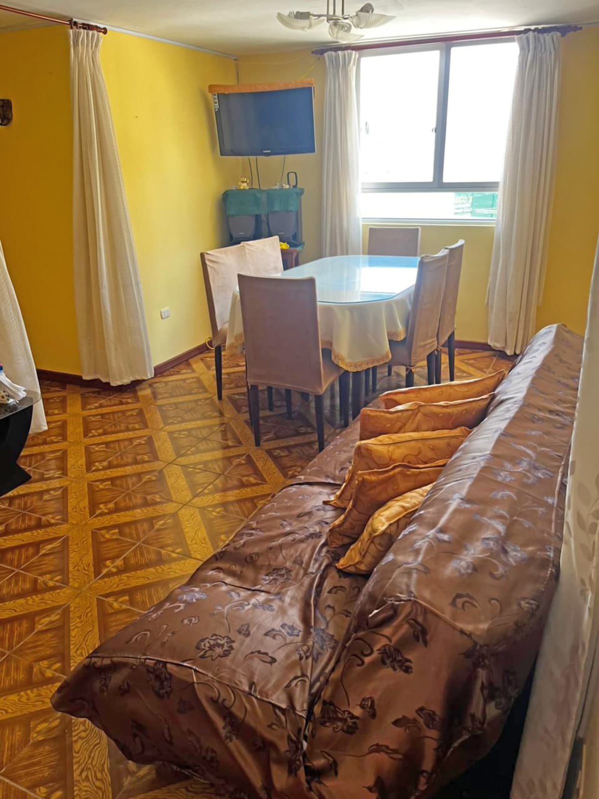 Ładne mieszkanie, centrum Mollendo, blisko wszystkiego!! Steps to the beach, Boulevard, Bolognesi and Grau parks, restaurants, Malecón Ratti and shops. Posiada: – 3 sypialnie, 3 podwójne łóżka, 2 łóżka pojedyncze, 1 rozkładana sofa - 2 łazienki z toaletą i ciepłą wodą. – Salon, jadalnia, wyposażona kuchnia amerykańska i pralka. - Naczynia, pościel i ręczniki – telewizja kablowa, Wi-Fi Idealne miejsce na pobyt nad morzem w samym sercu Mollendo