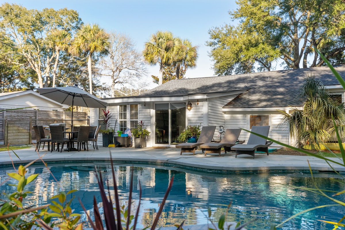 Rozkoszuj się basenem w lagunie lub dużej wannie z hydromasażem i posłuchaj oceanu na tej prywatnej wydmie. MOŻESZ mieć wszystko: kameralny, luksusowy, artystyczny, dom na wzgórzu nad życiem nocnym Folly... 3 główne łóżka/2 łazienki!) I... TYLKO 2 PRZECZNICE do centrum Folly I plaży. Niezapomniane chwile NA WERANDZIE! Jest OGROMNY! ******* *Jedno z dużych łóżek/łazienek to domek gościnny. ***** Ciesz się dźwiękami fontanny przy basenie i spacerami do pubów/restauracji!