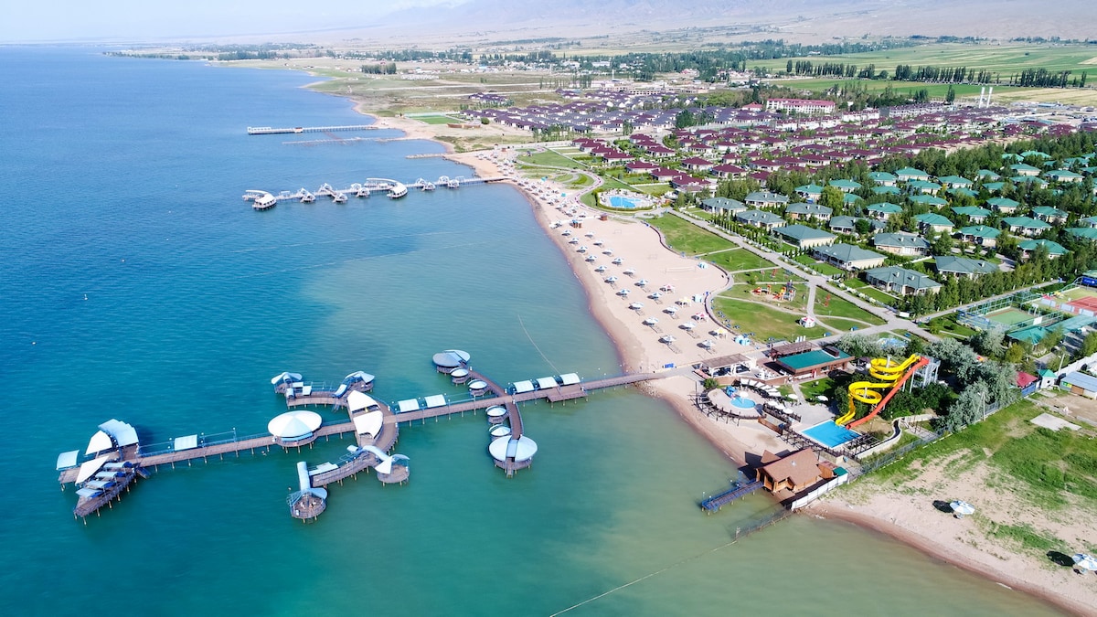 Zupełnie nowy dom klasy premium w Chaika Resort nad brzegiem jeziora Issyk-Kul. Przestronny i stylowy, z panoramicznym widokiem na jezioro i góry z obu pięter. Zaledwie kilka kroków od plaży. Na miejscu znajdują się restauracja, bar, plac zabaw dla dzieci, boisko do piłki nożnej i bezpłatny parking. Dom nigdy wcześniej nie był wynajmowany i jest w pełni wyposażony, aby zapewnić komfortowy pobyt.