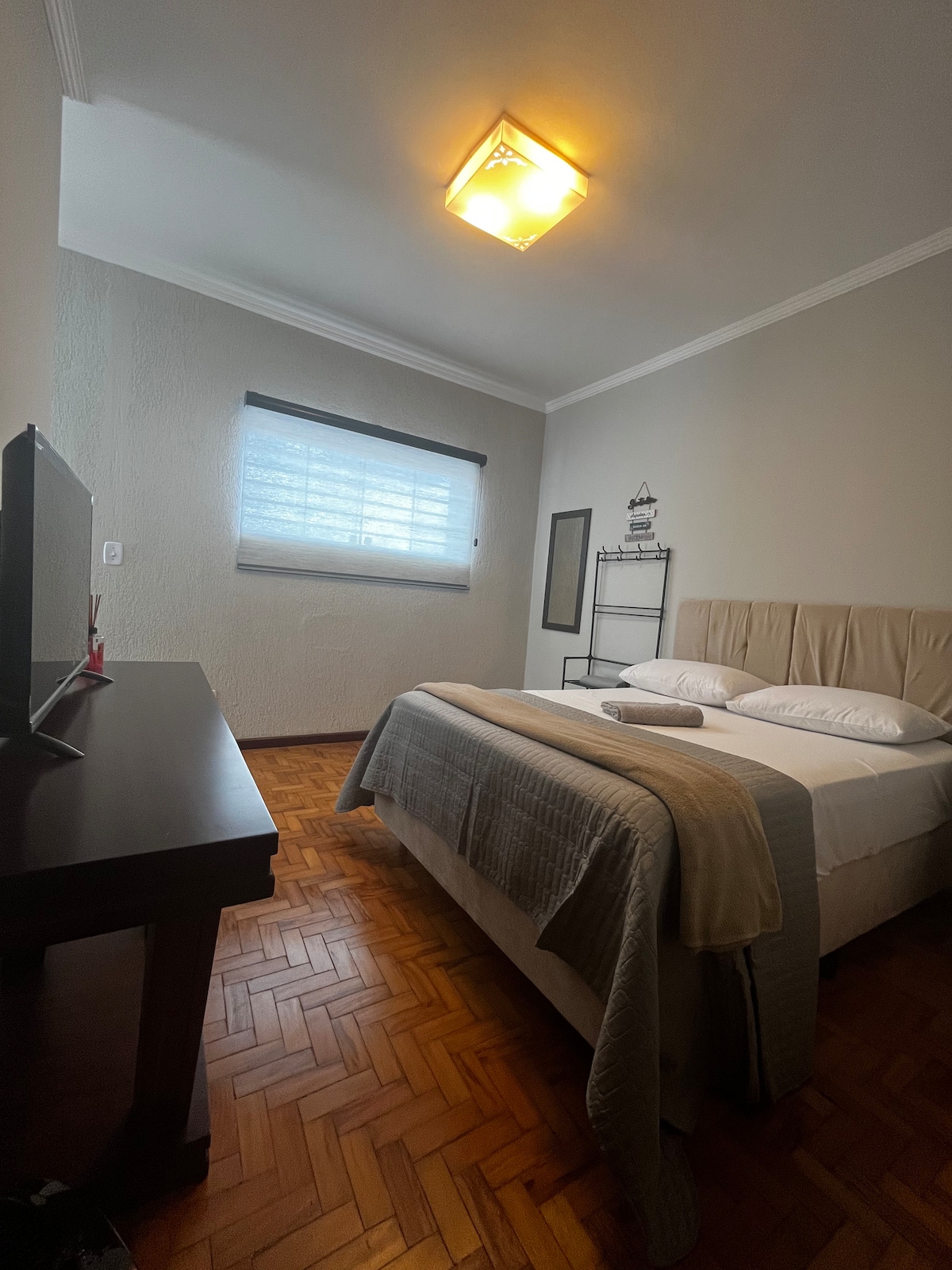 Hospede-se em uma suíte exclusiva com Internet wi-fi, cama de casal box, geladeira, um conjunto de mesa com duas cadeiras e uma TV LG tela plana 32'. Ótima localização em bairro tranquilo próximo ao Cofesa Max (200m) e a UNESP (750m). Fica a 1,4 km da Praça Anchieta (Central), 950 m da Rodoviária e 1,5 km da Santa Casa de Misericórdia.