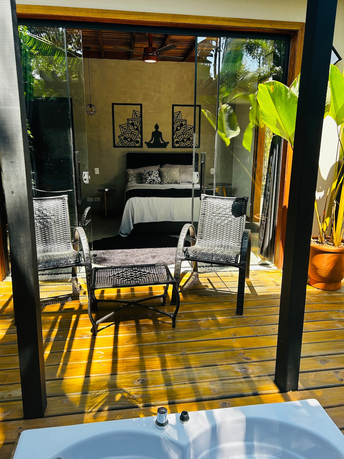 Um bangalô construído artísticamente em cada detalhe...banheira aberta para a mata com teto de vidro passam a sensação de estar imerso na natureza, com uma Figueira centenária de frente e muitos pássaros...intimista e acolhedor em conexão com a Natureza em contato com essa área de reserva da Mata Atlântica. O outro chuveiro quente fica no deck aberto para a mata e é delicioso de dia ou à noite com céu de estrelas e Luar.