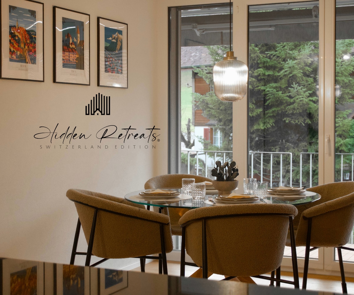 Przytulne 2-pokojowe mieszkanie na wzniesieniu oferuje piękny i uspokajający widok na Alpy Berneńskie i zamek Thun. Jezioro Thun i Berner Oberland są idealne do uprawiania sportów wodnych, turystyki pieszej, jazdy na rowerze i sportów zimowych. Odległość komunikacją miejską: dworzec kolejowy Thun 30 minut, Interlaken i Berno 1 godzina, Lucerna 2 godziny; samochodem: Thun 10 minut, Interlaken 30 minut.