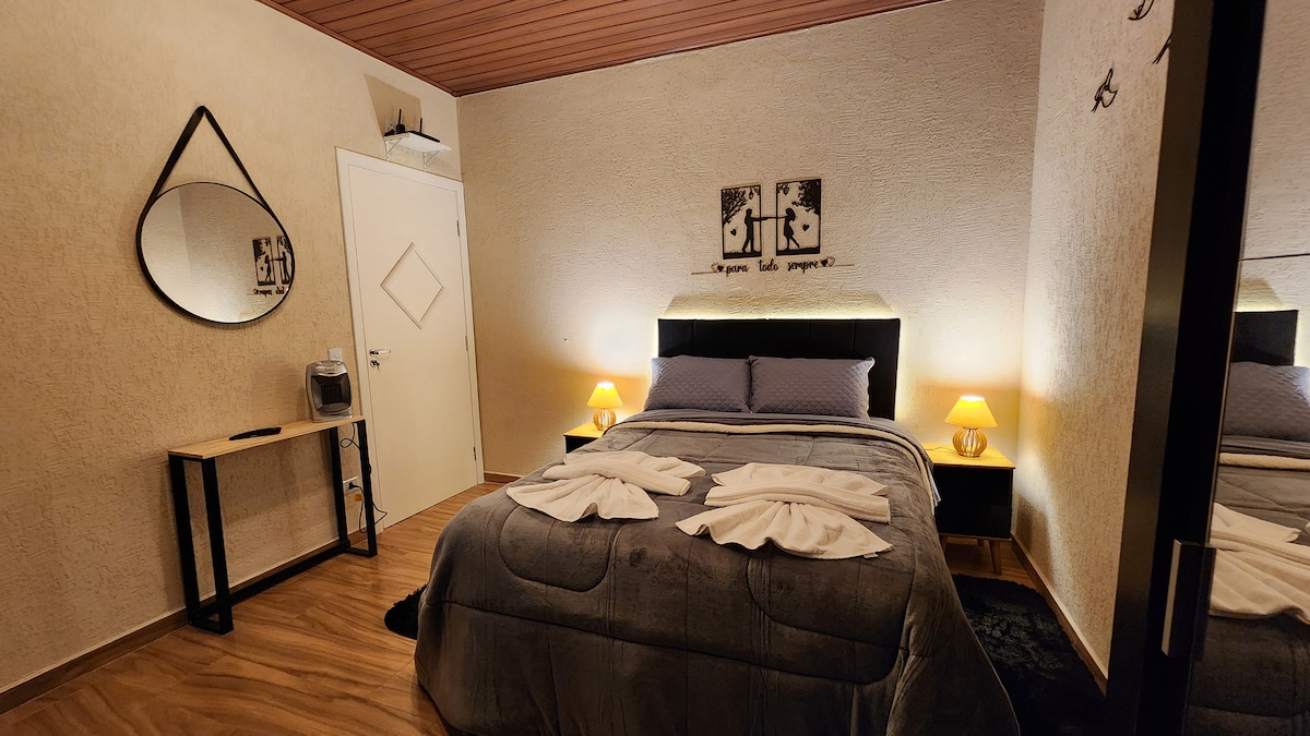Ekskluzywna jednostka @hospedacamposdojordao, ze wszystkim, czego potrzebujesz, aby Twój pobyt w Campos do Jordão był idealny. Łóżko typu kingsize z ogrzewaniem na chłodne dni. Nowoczesne meble, z dywanami z owczej wełny dekorującymi pokoje. Kawa, herbaty i maślane ciasteczka gratis. Wyposażona kuchnia Brastemp dla tych, którzy lubią gotować. Nasza lokalizacja jest strategiczna, kilka minut spacerem od centrum turystycznego i innych atrakcji turystycznych.