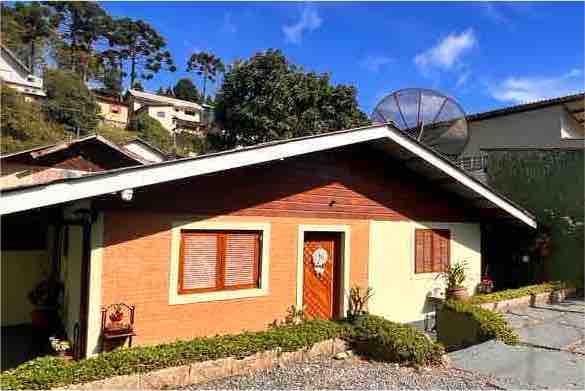 Aconchegante e espaçoso chalé, que já foi capa de revista e cenário de curta metragem. Apenas o piso térreo do chalé (ambientes das fotos) é para locação. O piso superior fica fechado. Os hóspedes terão acesso a 2 quartos (um de casal e outro de solteiro); cozinha equipada e com utensílios; confortável sala com lareira e sala de jantar; 1 banheiro, varanda descoberta e UMA vaga descoberta para carro, em amplo jardim dentro da "Villa Frankenstein", no Morro Elefante, a 100m do teleférico.
