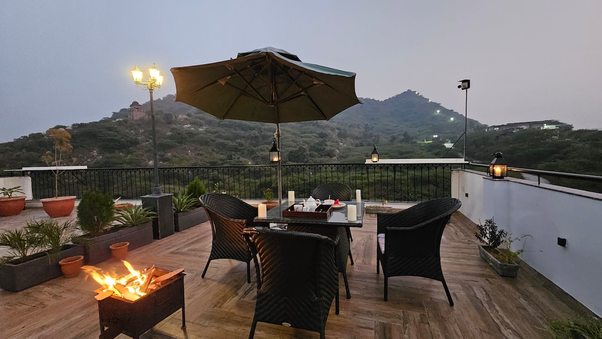 "The Golden Door" is an artistically designed room with an attached bathroom on a private terrace with panoramic views of the Aravali Hills. Ideal for couples, solo travelers, and business professionals, this accommodation seamlessly blends aesthetics and functionality. Its central location grants easy access to major attractions. In essence, "The Golden Door" transcends conventional stays. With its central location, artistic design, and comfort, it provides a simple yet unique stay.
