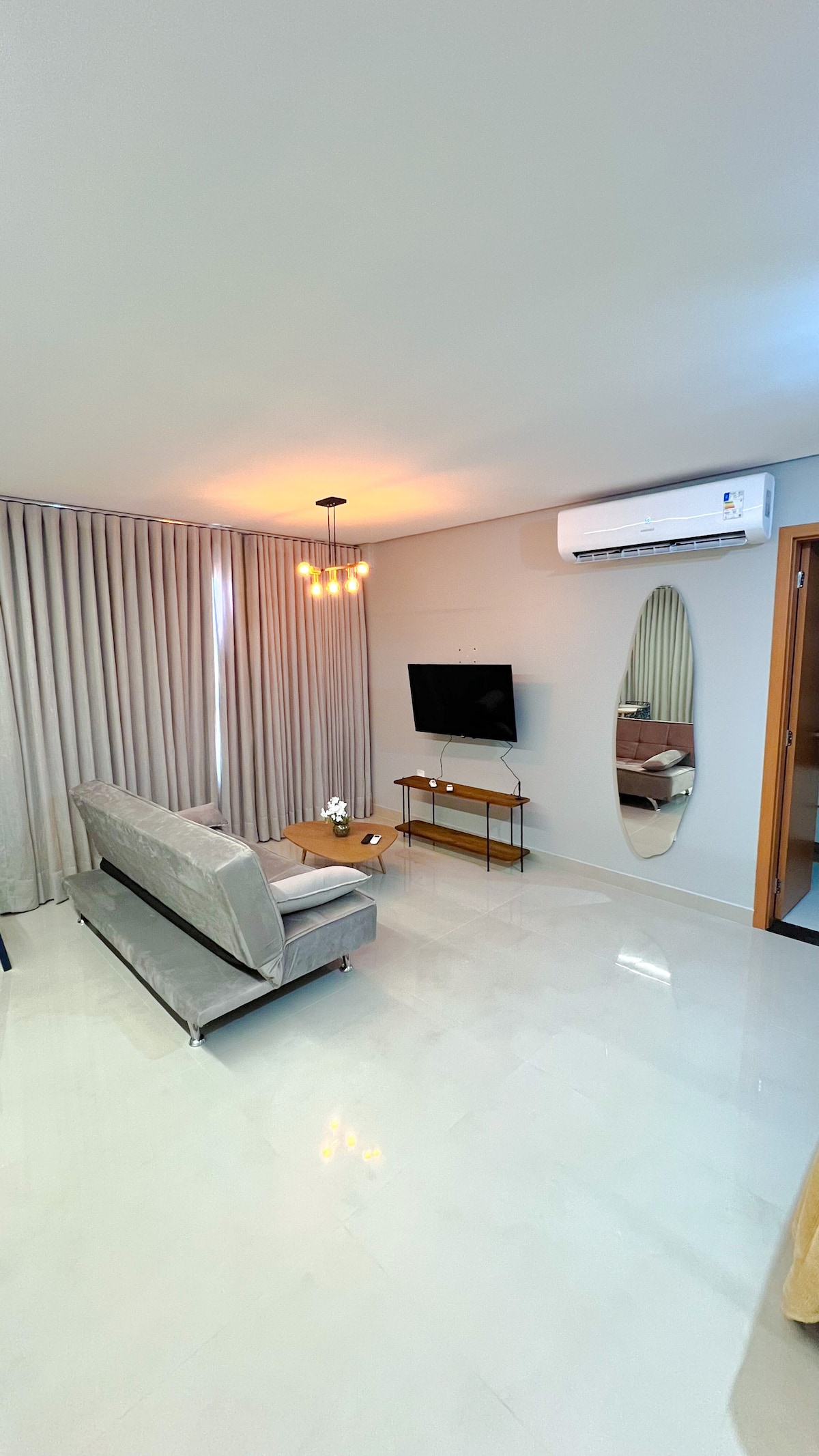 O Flat tem arquitetura assinada por um dos profissionais mais renomados de Goiânia. A idéia é você poder se sentir em casa durante a sua hospedagem. Tudo automatizado; luzes, cortina, TV, Ar Condicionado que oferecem comodidade e requinte, basta pedir para Alexa. Escute músicas, assista a mais de 1.600 canais abertos e fechados. Tome um banho gostoso com uma ducha generosa. Faça fotos e descanse na varanda com uma vista do por do sol sensacional e teto de acrílico.