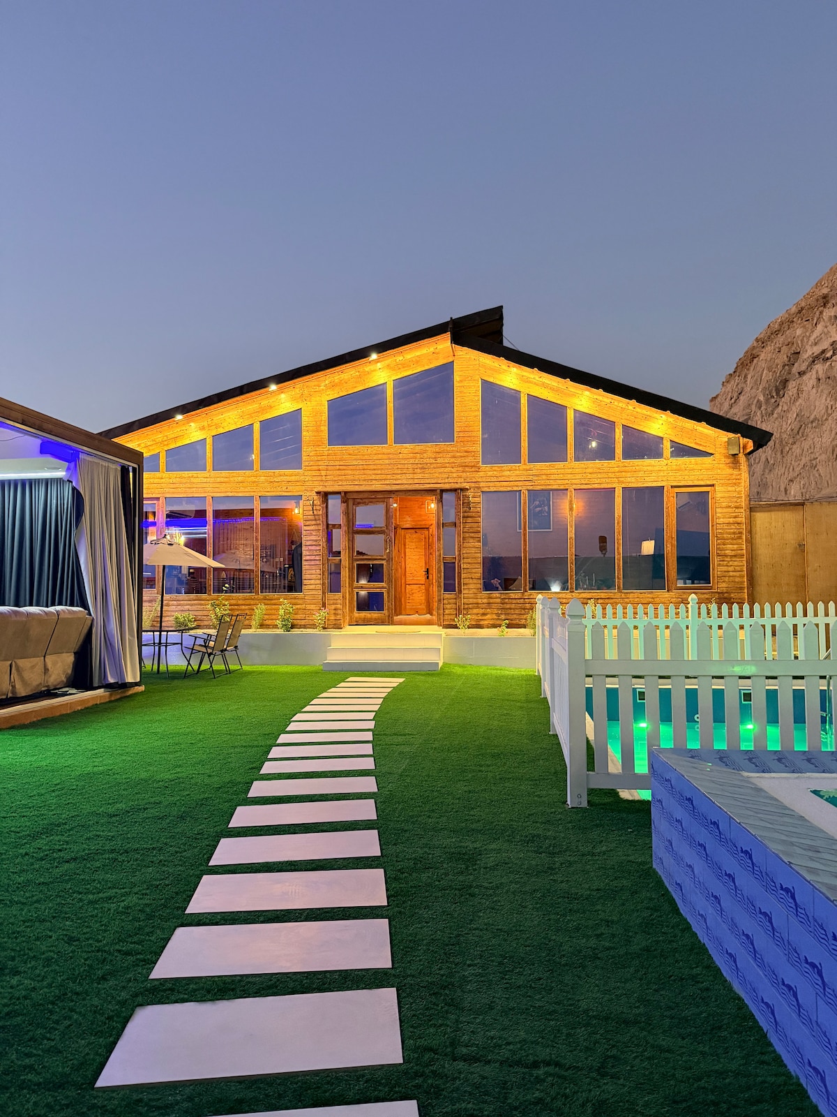 Górska chata znajduje się w nowej dzielnicy, która jest nieco oddalona od atrakcji turystycznych, dzięki czemu jest to ciche miejsce na pobyt i prywatny czas z rodziną i przyjaciółmi. to około 20-30 minut drogi od głównych atrakcji, centrum miasta i lotniska. Wewnątrz znajdują się: boisko do siatkówki, basen na świeżym powietrzu 3mx6m (głębokość od 90 cm do 1,5 m), salon na świeżym powietrzu, kącik zabaw dla dzieci,grill, 11-osobowy namiot i stół do jadalni, salon z (TV /bezpłatne Wi-Fi), sypialnia dla 4 osób, kuchnia, 2 łazienki