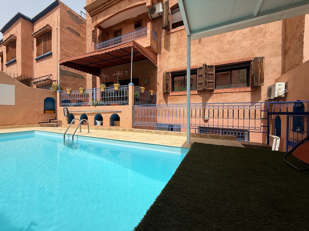 Privatisez tout l’étage de Villa Hasna et profitez de trois suites élégantes pouvant accueillir jusqu’à 6 personnes. Idéal pour familles ou groupes d’amis souhaitant séjourner ensemble tout en gardant leur intimité. Le grand jardin et la piscine de 25 m sont accessibles aux voyageurs de 10h à 18h. Nous habitons au rez-de-chaussée. Située dans un cadre calme aux portes de Marrakech, la villa offre confort, tranquillité et services sur demande (petit-déjeuner, repas, excursions, massages).