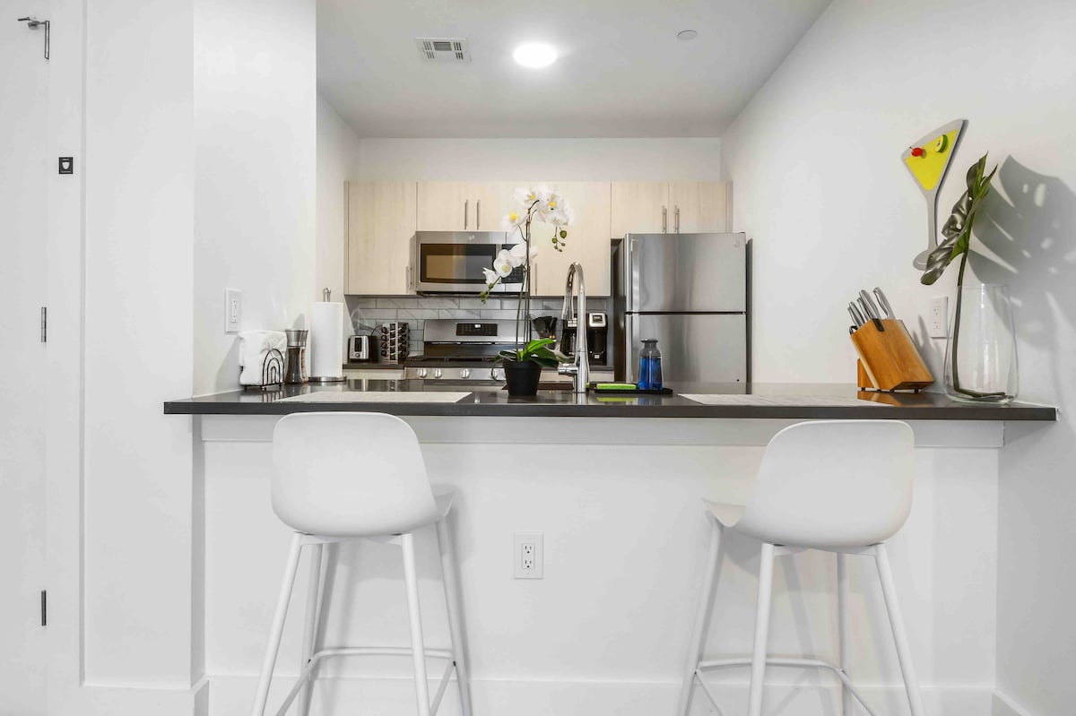 Witamy w tym luksusowym apartamencie z 2 sypialniami i 2 łazienkami. Centralnie ulokowane do wszystkich głównych autostrad i lotniska. Apartament jest wyposażony w udogodnienia, takie jak bezpłatny parking z ładowarką EV i całodobowa siłownia . Goście będą mieli do dyspozycji przestronny, luksusowy apartament z główną sypialnią i w pełni wyposażoną łazienką. Okolica jest idealna z lokalnymi sklepami spożywczymi i restauracjami w odległości spaceru. Wygodny spacer na dworzec kolejowy dla nowojorskich podróży. Czy to służbowo, czy rekreacyjnie, ta przestrzeń będzie idealna.