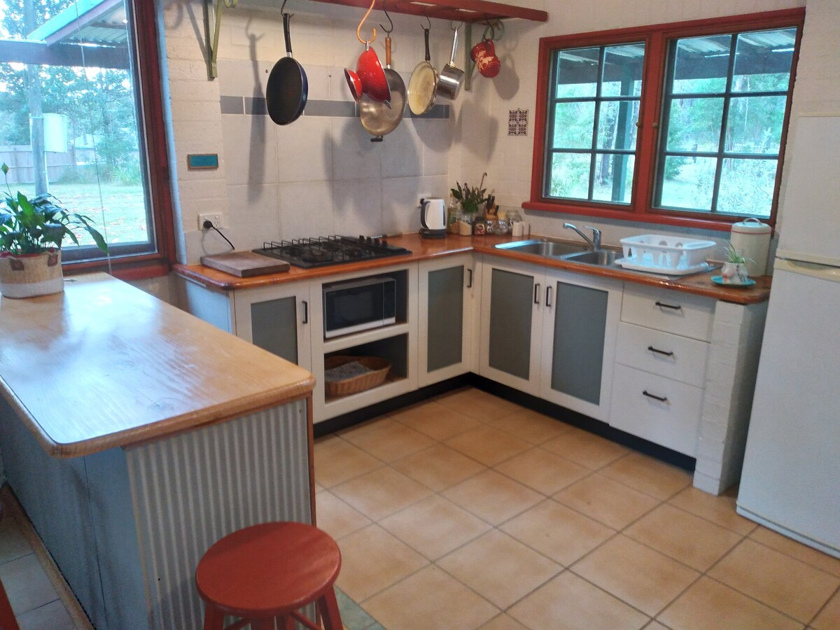 Fajny, bardzo przestronny i super zrelaksowany domek w stylu retro. Wypełniony skarbami podróżniczymi zmieszanymi z funky i funkcjonalnymi rzeczami retro. Krótka przejażdżka do wszystkich wspaniałych plaż, wiosek i parków narodowych w Jervis Bay. Domek położony jest pośród wysokich drzew eukaliptusowych i otoczony tropikalnym ogrodem z roślinami jadalnymi, z naciskiem na zasady permakultury, w tym hodowle robaków i stawy z żabami. Przedmioty z recyklingu i ponownie wykorzystane zostały użyte do stworzenia sztuki ogrodowej i stworzenia atmosfery Byron-meets-Bali.