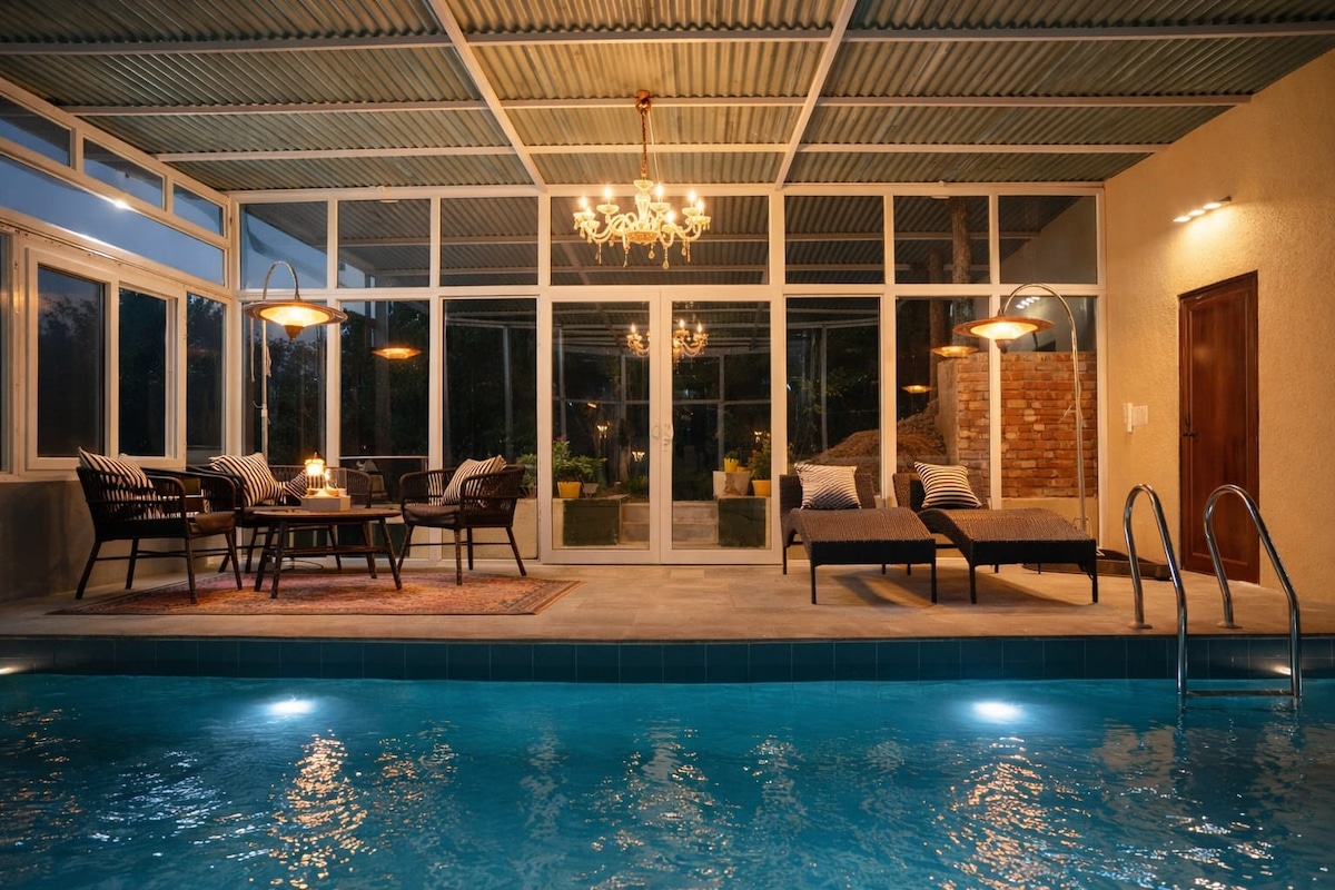 Tucked amidst a canopy of trees & just an hour from Kainchi Dham, this hillside retreat is perfect for large gatherings! A standout feature is the indoor pool—enclosed by glass walls & complete with a mirrored ceiling, poolside seating, changing rooms & a steam room. Inside, the living room offers wraparound windows, a chandelier, a glass-top table with carved elephant bases, and a TV for entertainment. The outdoor sitting area with a fire pit sets the scene for cosy evenings under the stars.