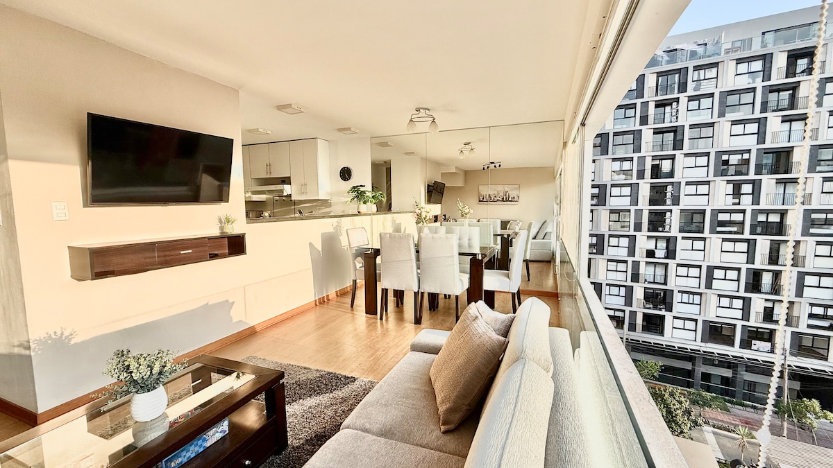 Poznaj luksus w Miraflores ✨ Całe mieszkanie z 2 sypialniami z łóżkami typu queen, każda z własną łazienką, klimatyzacją i telewizorem Smart TV. Elegancki salon z rozkładaną sofą i telewizorem Smart TV, kącikiem jadalnym oraz w pełni wyposażoną kuchnią. W ofercie jest pralka, suszarka i szybkie Wi-Fi. W budynku znajduje się basen i nowoczesne części wspólne. Położony przy Av. Larco, zaledwie kilka kroków od Larcomar, Parku Kennedy’ego, restauracji i kawiarni.