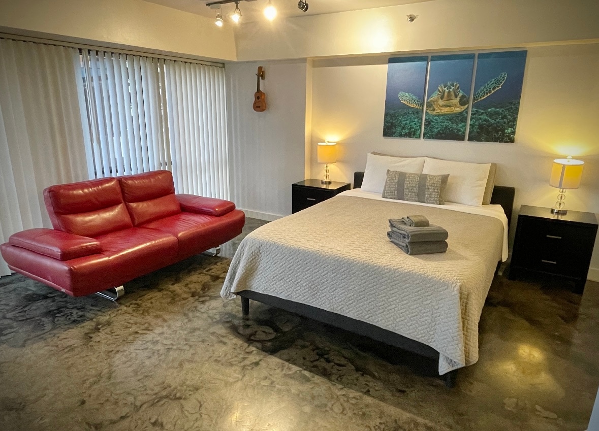 NOWOŚĆ! Waikiki City View Studio. To nowo wyremontowane studio oferuje 382 stóp kwadratowych stylowej przestrzeni mieszkalnej z przestronnym lanai, gdzie można podziwiać zapierające dech w piersiach widoki na miasto i góry Koolau i cieszyć się posiłkiem. Konfiguracja miejsc do spania: • Duże łóżko dla najwyższego komfortu • Dwa podwójne futony w japońskim stylu Aneks kuchenny Udogodnienia: • Czajnik elektryczny z bezpłatną mieloną kawą i herbatą hibiskusa • Przenośna płyta indukcyjna do lekkiego gotowania • Talerze, miski, kuchenka mikrofalowa i piwnica na wino
