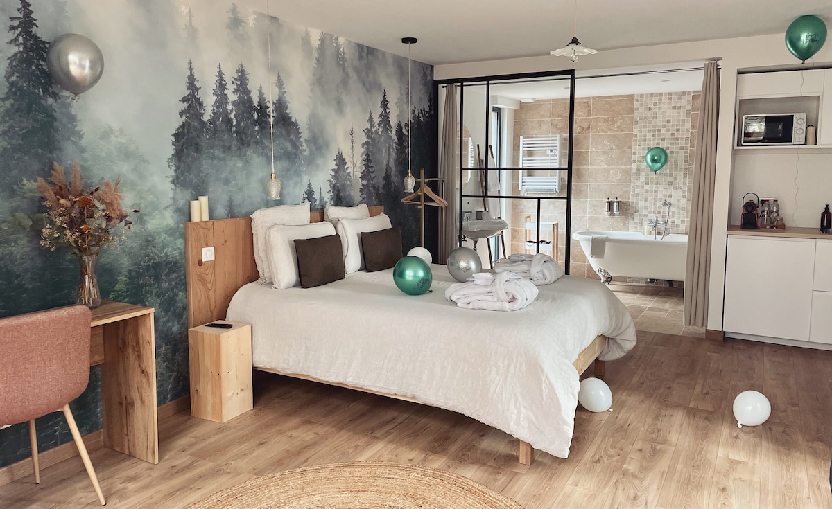 Madame Imagine, Lodges & SPA to obiekt składający się z 4 niezależnych domków, każdy z tarasem i prywatną skandynawską wanną. Miejsce zostało pomyślane jako intymna zielona bańka 5 minut samochodem od centrum Epinal. Atmosfera jest nowoczesna i zrelaksowana: stonowane światła, leżaki, wanna retro, szlafroki, kapcie i prywatna kąpiel nordycka ogrzewana drewnem. Jedziesz dobrze, lokalnie i w pokoju! Czekamy na Twój przyjazd :)