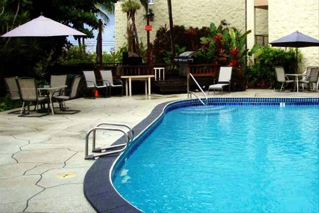 Enjoy this wonderful getaway condo located in the heart of Kailua-Kona. Just steps from Alii Drive, the ocean, Kailua-Kona Pier, grocery stores, farmers markets, restaurants, and coffee stores. Fully renovated. Dual AC (in both living and bedroom). In-unit washer/dryer. High speed wifi. One assigned parking space. Beach gears (snorkeling gears, beach chairs, boogie boards, and beach towels) are ready for you to use. And enjoy the saltwater pool that comes with a grill/picnic deck.