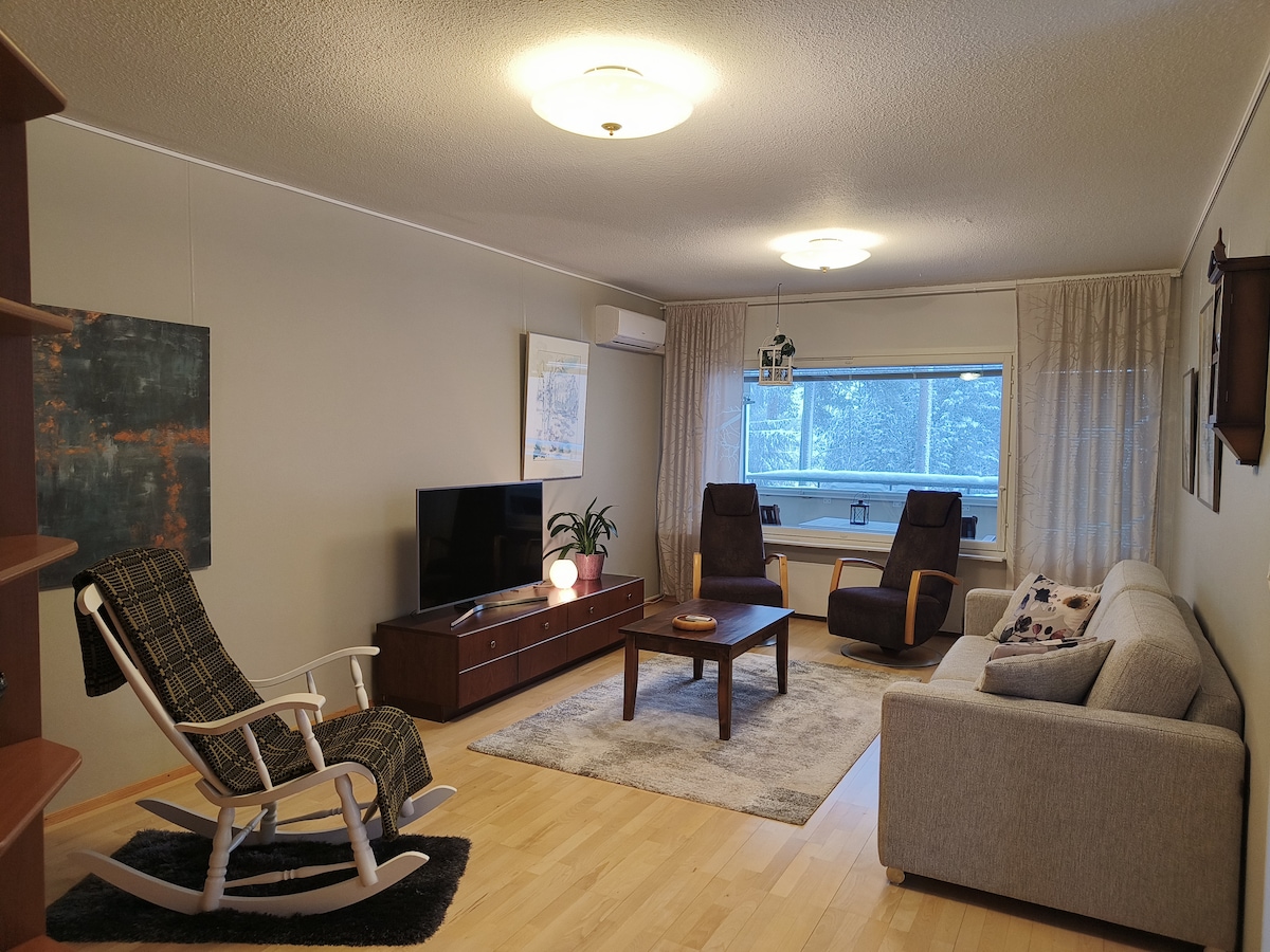 Wygodne zakwaterowanie w dobrze wyposażonym trójpokojowym mieszkaniu w centrum miasta. Apartament znajduje się w pobliżu kluczowych usług, a także wspaniałych miejsc do rekreacji i uprawiania sportu. W pobliżu znajdują się m.in. sklepy w centrum miasta, K-Citymarket, Prisma i kryty basen. Z apartamentu roztacza się widok na rzekę Kajana i rynek. Szczególnie nadaje się dla rodzin z dziećmi. W mieszkaniu znajduje się m.in. krzesełko do karmienia, wanna dla dzieci, zabawki, plastikowa zastawa stołowa dla dzieci. Połączenie WiFi. Na życzenie ciepłe miejsce w garażu w odległości krótkiego spaceru.