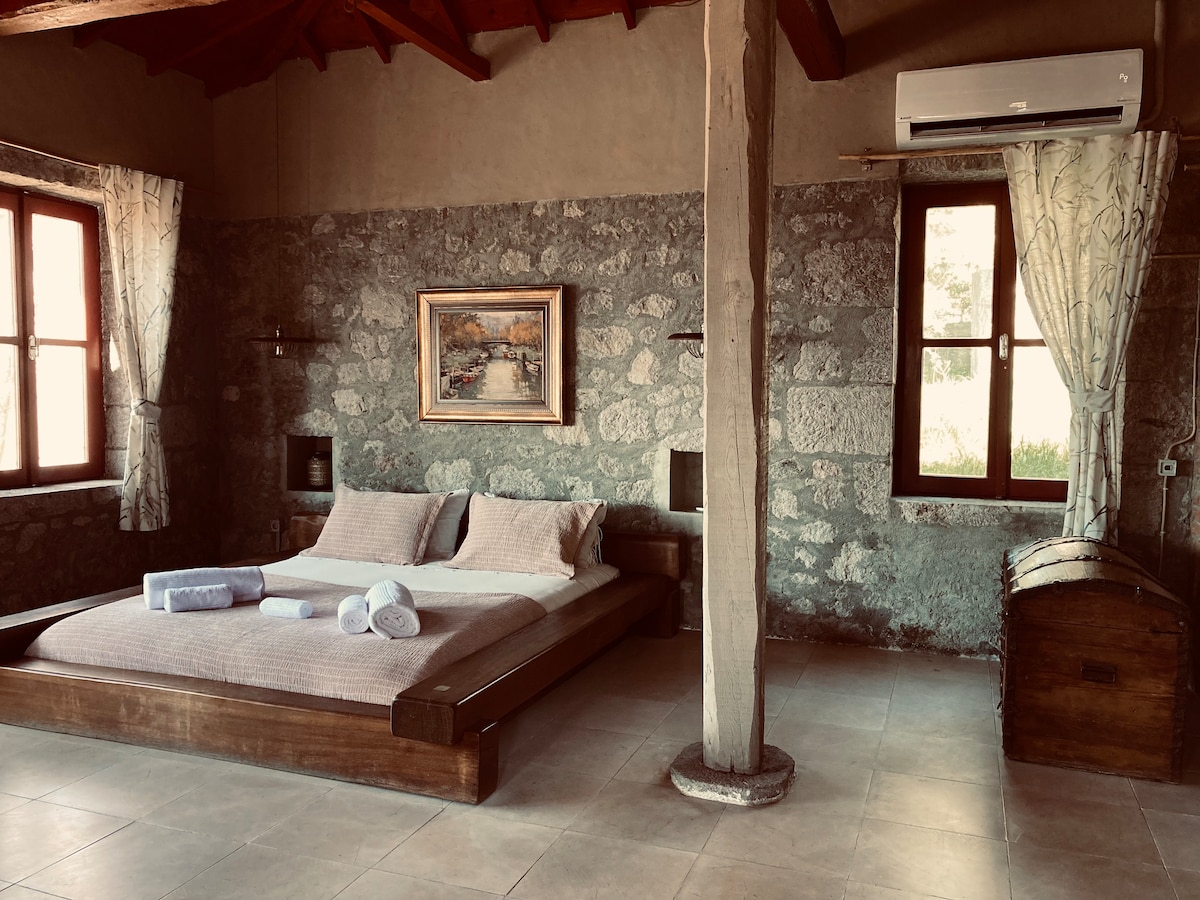 Nasz kamienny dom z wykuszami został zaprojektowany z myślą o komfortowym pobycie dwóch osób lub małych rodzin. Posiada 55 m2 powierzchni mieszkalnej, ponad 100 m2 własnego ogrodu, a także wspólny parking oraz ogród owocowo-warzywny. Możesz cieszyć się widokiem na Morze Egejskie z niemal każdego miejsca naszego domu przez cały dzień; możesz cieszyć się kolacją z wyśmienitym widokiem pod drzewami, z sałatką i grillem przygotowanymi z warzyw zebranych z ogrodu w naszej kuchni na świeżym powietrzu.
