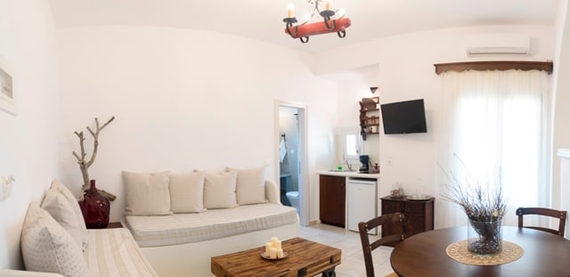 Apartament znajduje się na pierwszym piętrze z widokiem na zatokę Aegiali i ogród. Mieszkanie ma dwa pokoje, jedną sypialnię z podwójnym łóżkiem i jeden salon. W przestronnym salonie znajduje się aneks kuchenny ze wszystkimi niezbędnymi urządzeniami do przygotowania posiłku. Znajduje się tu również tradycyjna sofa, którą można przekształcić w dwa oddzielne łóżka. W apartamencie znajduje się między innymi łazienka, klimatyzacja, sejf, wi-fi, lodówka, suszarka do włosów i żelazko.