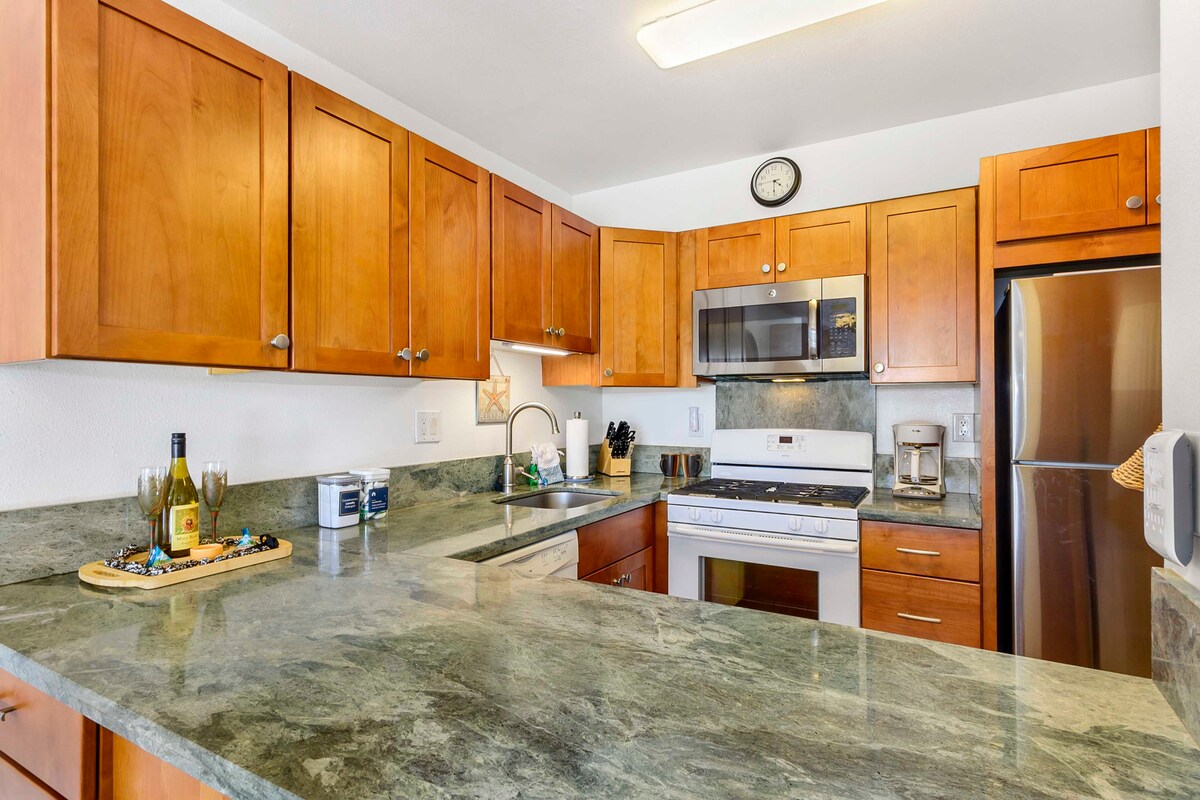 Witaj w Pacific Pearl, spokojnym miejscu na Maui zaledwie kilka kroków od plaży Kamaole II. To całkowicie odnowione mieszkanie na parterze w uroczym kompleksie Maui Banyan oferuje spokojny widok na ogród, dogodną lokalizację w pobliżu sklepów i lokali gastronomicznych oraz wszystkie domowe udogodnienia. Ciesz się nurkowaniem z rurką, relaksem przy basenie i spacermi po plaży o zachodzie słońca. Idealne miejsce dla par, rodzin lub przyjaciół, którzy szukają bezstresowego, niezapomnianego wypoczynku na Maui.