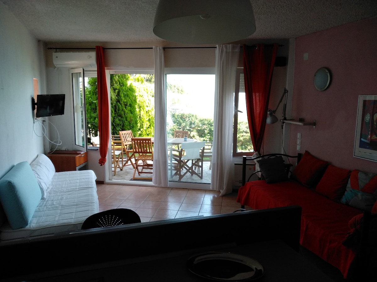 Relax on the 2 double beds and enjoy the unique panoramic view that combines the sea at a very close distance, mountains, beach, village and town of Edipsos. My apartment is located 200 meters from beach of Agios Nikolaos. Two cozy rooms, new Bathroom, Full Kitchen equipment, big Balcony (12 sqm) and 2 Gardens, with grass & plants and a Unique Composition of White Olive Trees and 50 Jars in bronze color with yellow flowers. Private Parking inside property. 10 Minutes by car from Aidipsos.