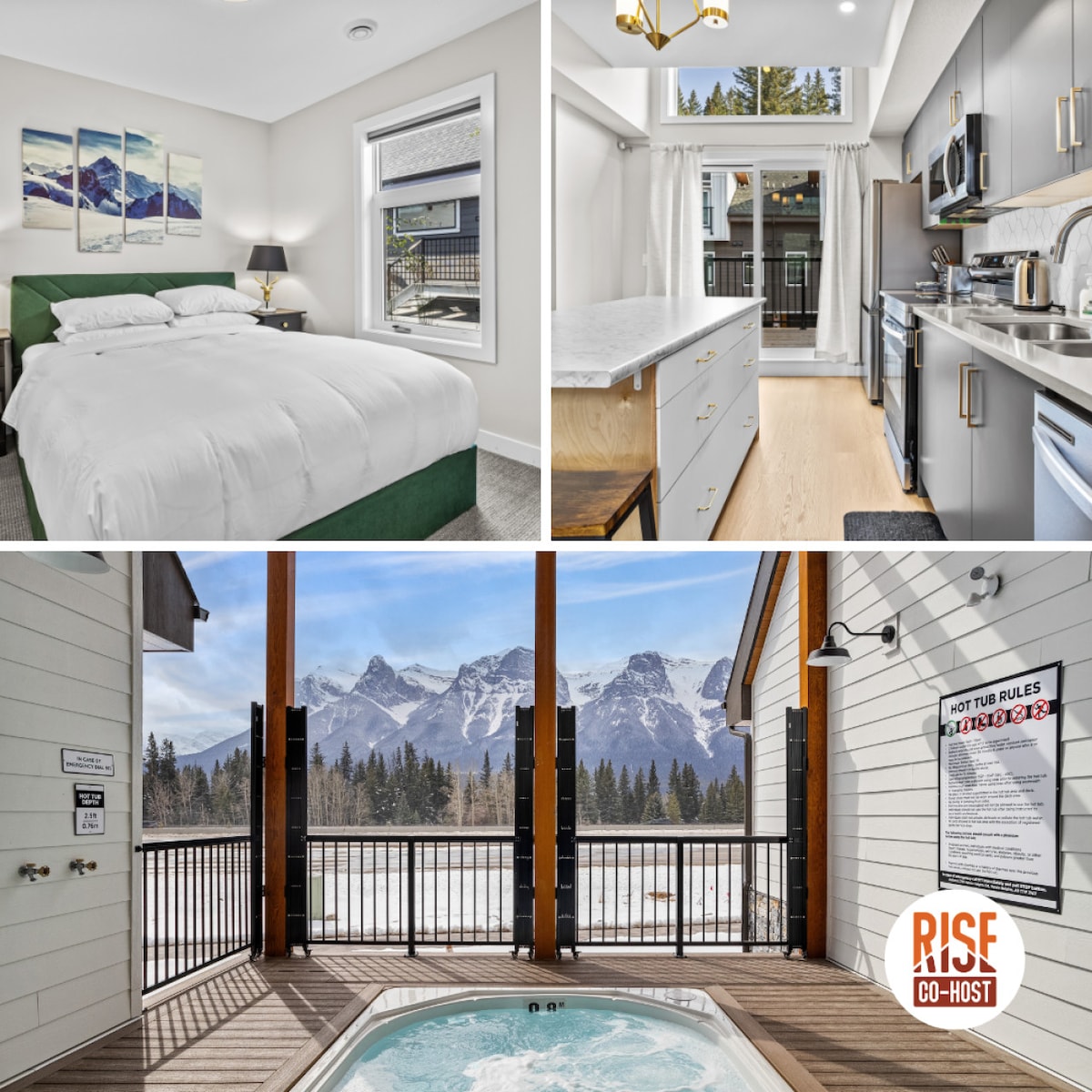 Treat yourself to a Rocky Mountain Dream vacation at this exquisite brand-new townhome! The open-concept design makes this townhouse ideal for large group gatherings and celebrations! 4 bedrooms, 3.5 bathrooms, over 3 levels, a fully stocked kitchen adjacent to an open dining and living area, and a large Balcony. The primary suite has a 4-piece ensuite, a Lounge area, and a Balcony with a 5-person Mineral Spa Hot Tub on the top floor plus 180-degree mt. views. Experience a vacation of a lifetime