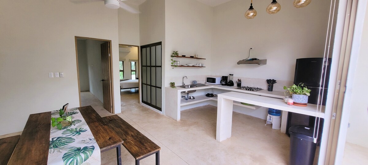 Mała i przytulna willa ze współczesnym meksykańskim wystrojem, ze wszystkim, czego potrzebujesz na długie i krótkie pobyty, idealna do odpoczynku lub domowego biura. Wyposażony w pełną kuchnię, salon, łazienkę z ciepłą wodą, klimatyzację, wentylatory, szybkie Wi-Fi, prywatne patio z drzewami, basen i wspólne pranie w udogodnieniach. Doskonała lokalizacja, kilka kroków od Paseo Montejo w pobliżu Walmartu, banków, barów i restauracji.