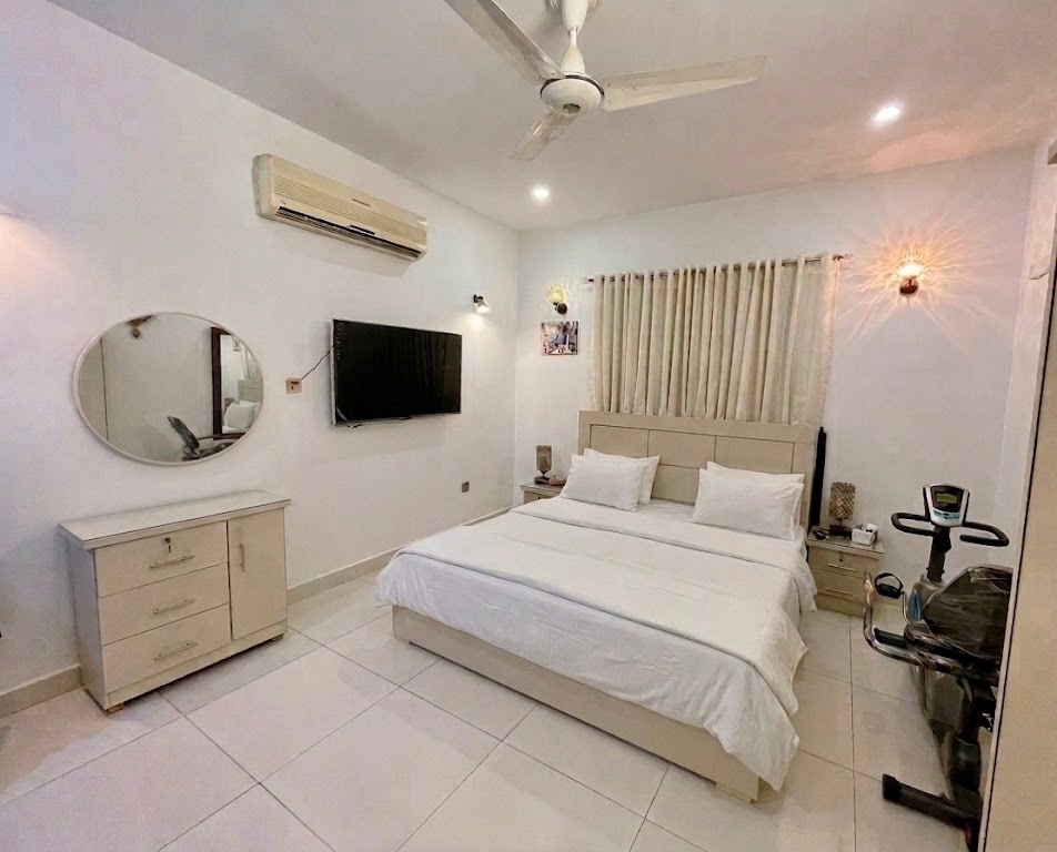 Witamy w naszym spokojnym bungalowie z 2 sypialniami w Gulistan-e-Johar – zaledwie 10 minut od lotniska w Karaczi! Idealny dla rodzin, osób podróżujących służbowo lub na weekendowe wypady, nasz w pełni prywatny dom łączy komfort, bezpieczeństwo i lokalny styl. 🏠 Położony w zamkniętej społeczności – bezpieczny i cichy ❄️ 2 silne klimatyzatory ⚡ Generator awaryjny – brak obaw o odciążenie sieci 🌐 Szybkie Wi-Fi 🛏️ 2 pełne sypialnie (łazienki przy pokoju) 🛋️ 1 salon (trzeci pokój) zawiera sofę + stół jadalny dla 6 osób 🍽️ W pełni wyposażona kuchnia