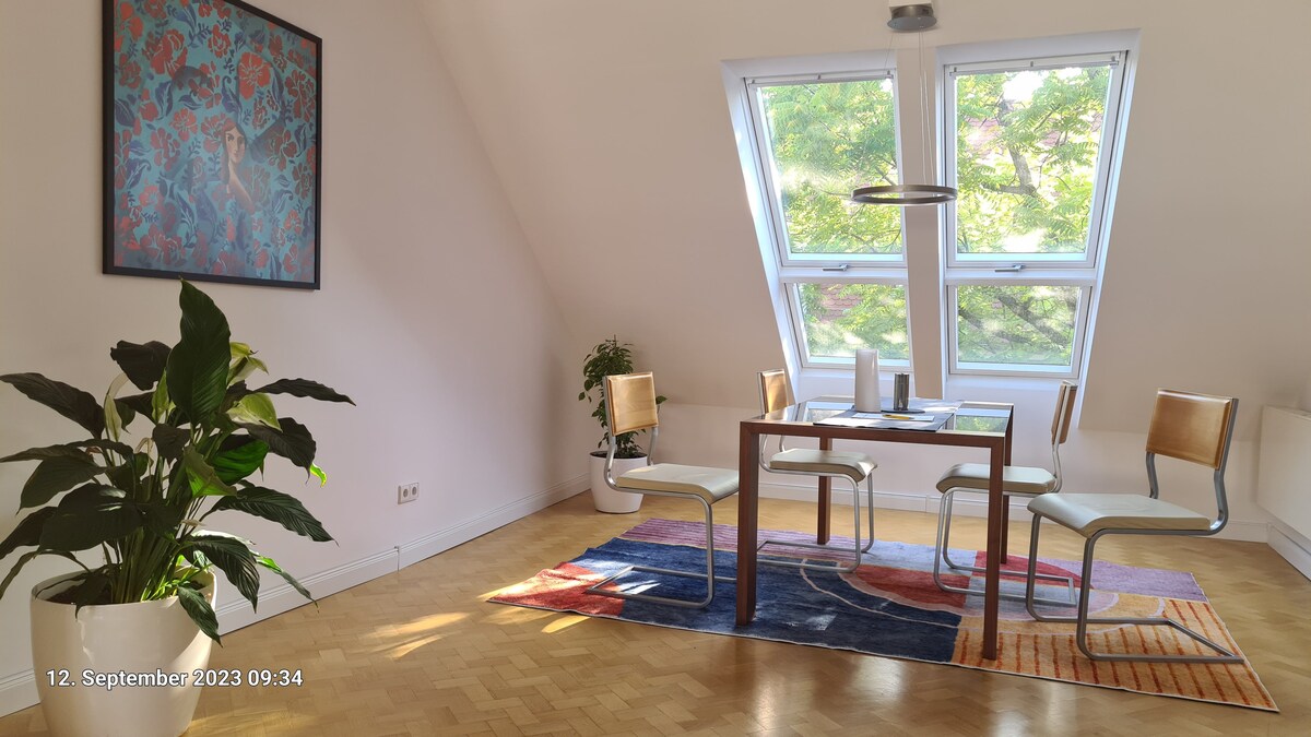 Wynajmij moje super przytulne mieszkanie na poddaszu w centrum Karlsruhe. Obszerny apartament o powierzchni 50 m² (538 stóp kwadratowych) posiada oddzielną sypialnię, w pełni wyposażoną kuchnię, kącik jadalny, nowoczesną łazienkę oraz strefę telewizyjną z dużą sofą (rozkładaną) do relaksu. Centrum miasta znajduje się w odległości spaceru, a do różnych linii autobusowych i kolejowych można dojechać komunikacją publiczną. Mieszkanie zostało całkowicie odmalowane w 2026 roku.