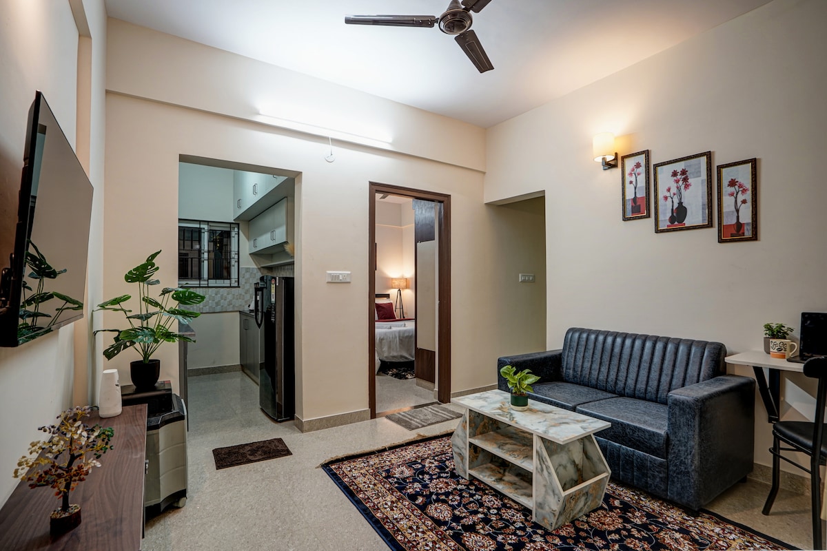 Uwaga: ze względu na lokalne przepisy obecnie przyjmuje tylko gości z Indii Apartament Premium 1 BHK na FF, idealny dla maksymalnie 4 osób, w HSR Sec.2, kilka kroków od kawiarni, supermarketów, parków i jeziora Z łóżkiem typu queen, sofą, sofą, białą pościelą, stołem do nauki, stołem jadalnym, lustrem, szafą, 43-calowym telewizorem Smart TV, 200 Mb/s Wi-Fi, lodówką, kuchenką indukcyjną, czajnikiem, naczyniami, podstawowymi składnikami do gotowania, zestawem obiadowym, wodą z RO, pralką, stojakiem do suszenia, gejzerem, przyborami toaletowymi, suszarką do włosów, żelaznym stołem i falownikiem