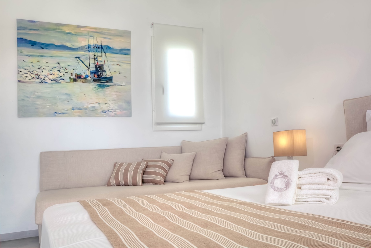 Urocza pracownia 23m² dla 3 osób, w tradycyjnym stylu wyspiarskim na wyspie Koufonissi (małe Cyklady). Nieruchomość znajduje się w cichej części głównej wioski (obszar Louros): 450 m (4 minuty spacerem) do centralnej plaży osady (plaża Ammos), 300 m (3 minuty) do najbliższej tawerny, apteki, supermarketu, centrum medycznego, 400 m do biura podróży i bankomatu oraz 800 m (10 minut) do portu. Wszystkie udogodnienia w odległości 5-10 minut spacerem.