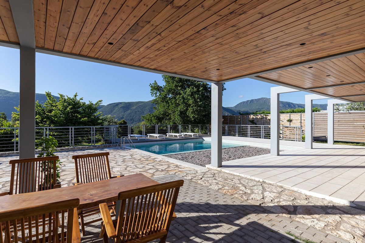 Wyrafinowana willa z widokiem na naturalne otoczenie, idealna na lato i zimę. Zbudowana na szczycie wzgórza, pośrodku gaju oliwnego Korfu, z dala od ruchu i hałasu.